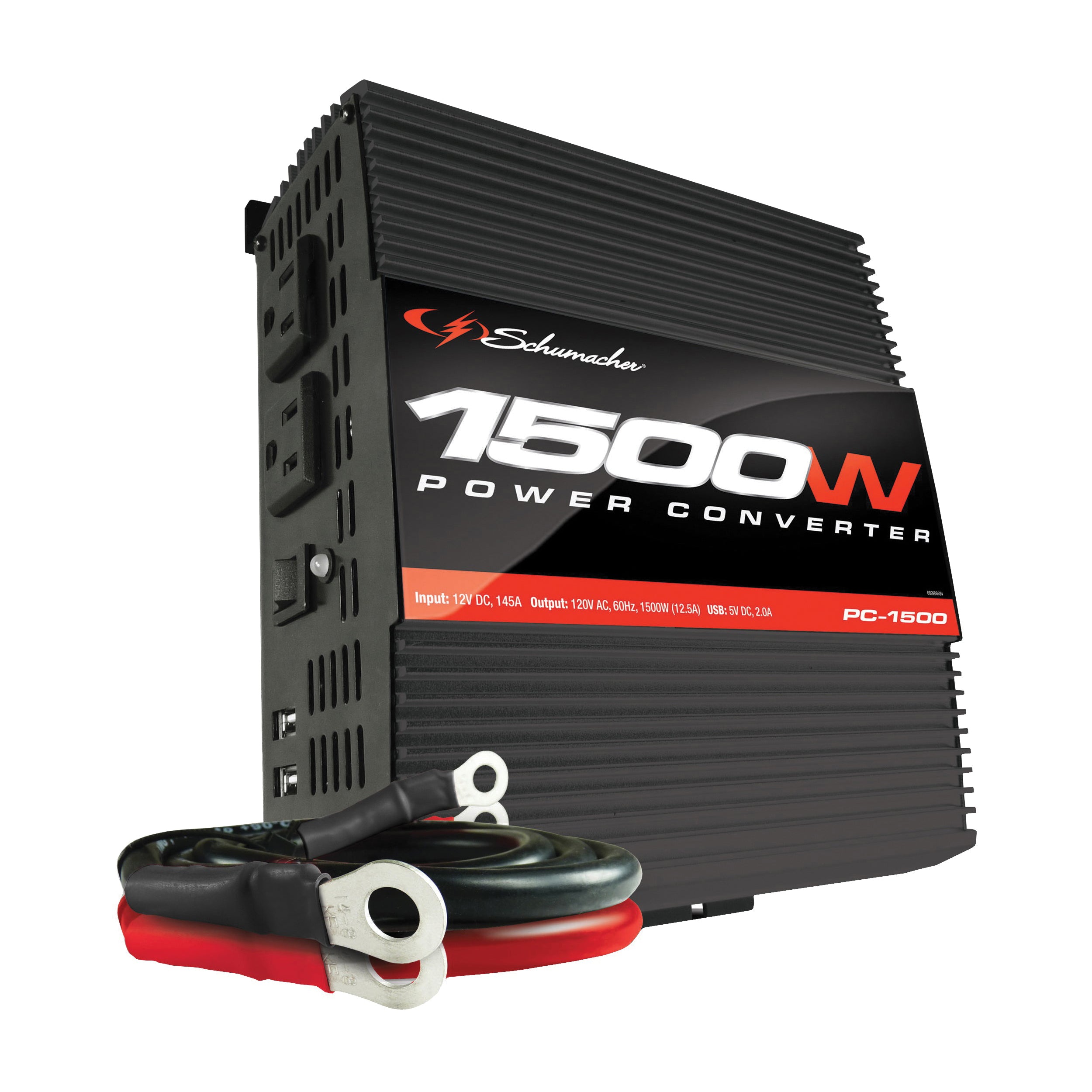 Converts 12 VDC to 115 VAC. Has two NEMA 5-15 USA AC outlets and 5 V, 2 A USB ports. Built-in, high-speed cooling fans help keep the unit cool. On/Off switch and LED Indicator. Heavy-duty battery cables connect directly to vehicle battery. Thermal protection, surge protection and low battery alarm. Contains a power converter, set battery cables, ground wire, owner's manual.