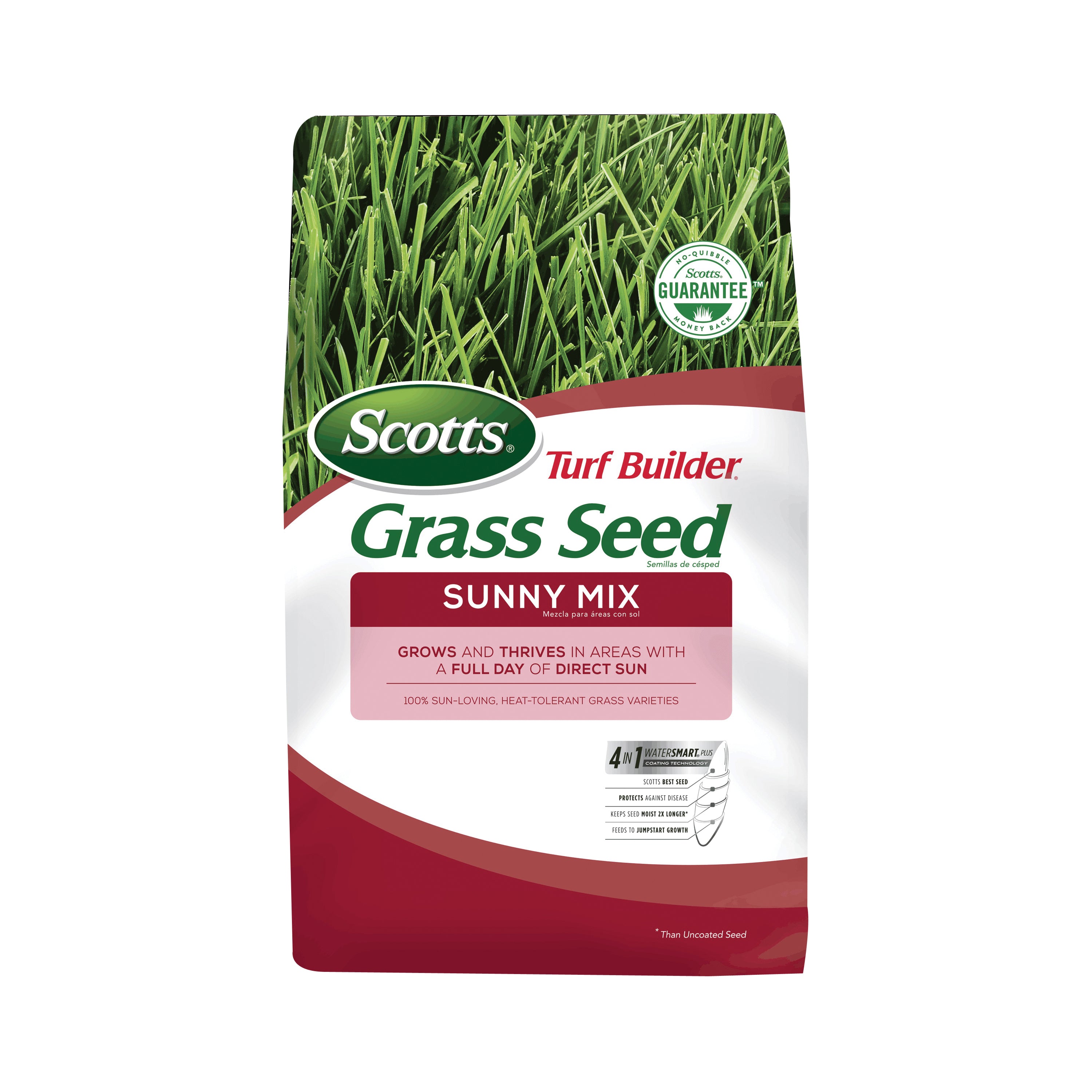 Scotts® Turf Builder® grass seed Sunny Mix® grows and thrives in areas with a full day of direct sun. The mix contains 100% sun-loving, heat-tolerant grass varieties. The exclusive four-in-one WaterSmart® PLUS coating absorbs 2X more water than uncoated seed, feeds with essential nutrients and helps protect seedlings from disease. Grow quicker, thicker, greener grass. Assured.
