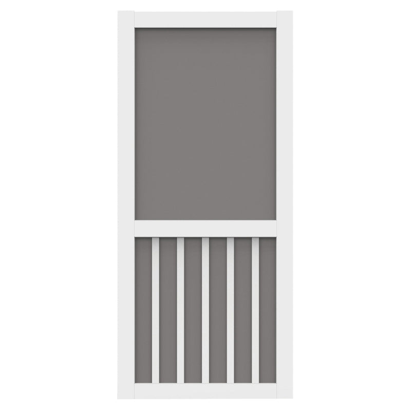 Low maintenance vinyl never needs painting and will not rot, fade, split or chip. Durable and trimmable frame up to 3/8 in off sides and top and 1 in off bottom. Easy to install and rescreen; can use a variety of standard screen door hardware. Comes with a 3 year warranty; product is UV protected.