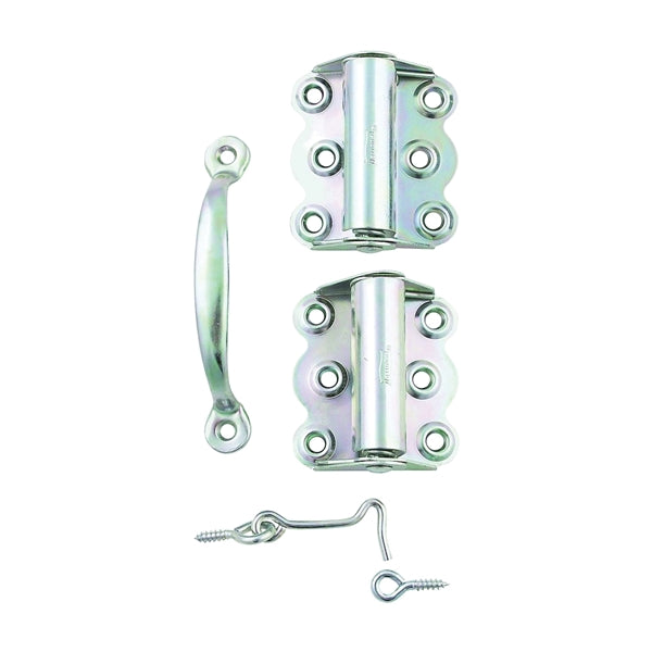Tight pin hinge with the enclosed spring is for left or right mount applications. Designed for full surface applications. Set includes 1-pair #122 spring hinges, 1 - #2 hook and eye and 1 - #2 pull. Steel hinges, hooks, eyes and pull. Visual pack.