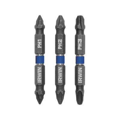 Irwin Impact Bit Set, Double-Ended, Specifications: 1/4 in Shank, 2-1/2 in L, Steel, 3 Piece, Includes: (1) #1 x #1 Phillips, (1) #2 x #2 Phillips, (1) (1) #3 x #3 Phillips