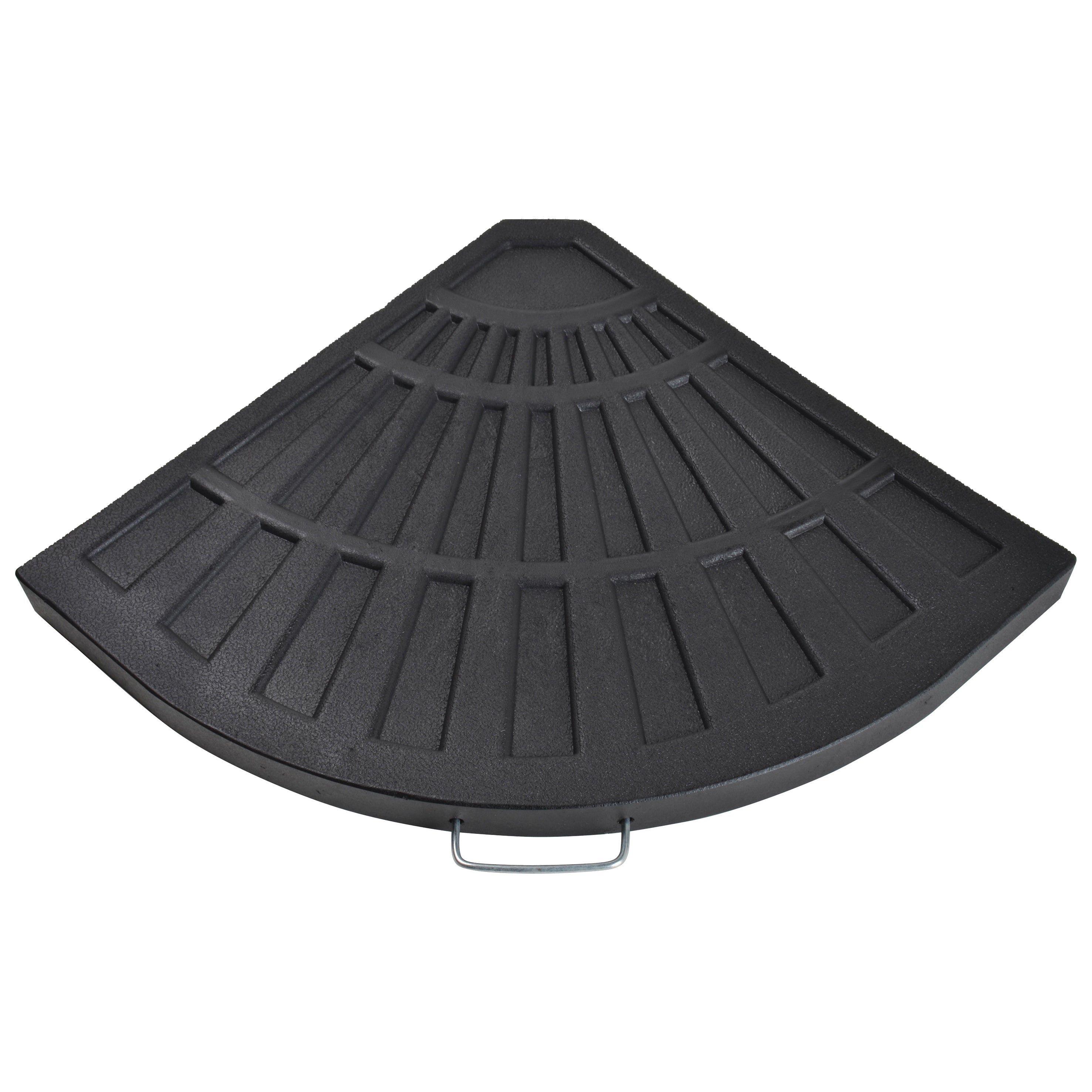 The deep black 30 lb offset ombrella sector base ties in your patio decor beautifully, as it supports your patio umbrella. Whether it's over a dining table or off to the side, this base helps provide years of shaded enjoyment to you and your guests. Constructed of durable EnvirostoneT it is weather and UV-resistant. The side lever secures the pole in place, while the adjustable inserts accommodate varying pole diameters. This umbrella base features an elegant hand applied woven textured finish, lending itself to any patio or deck.