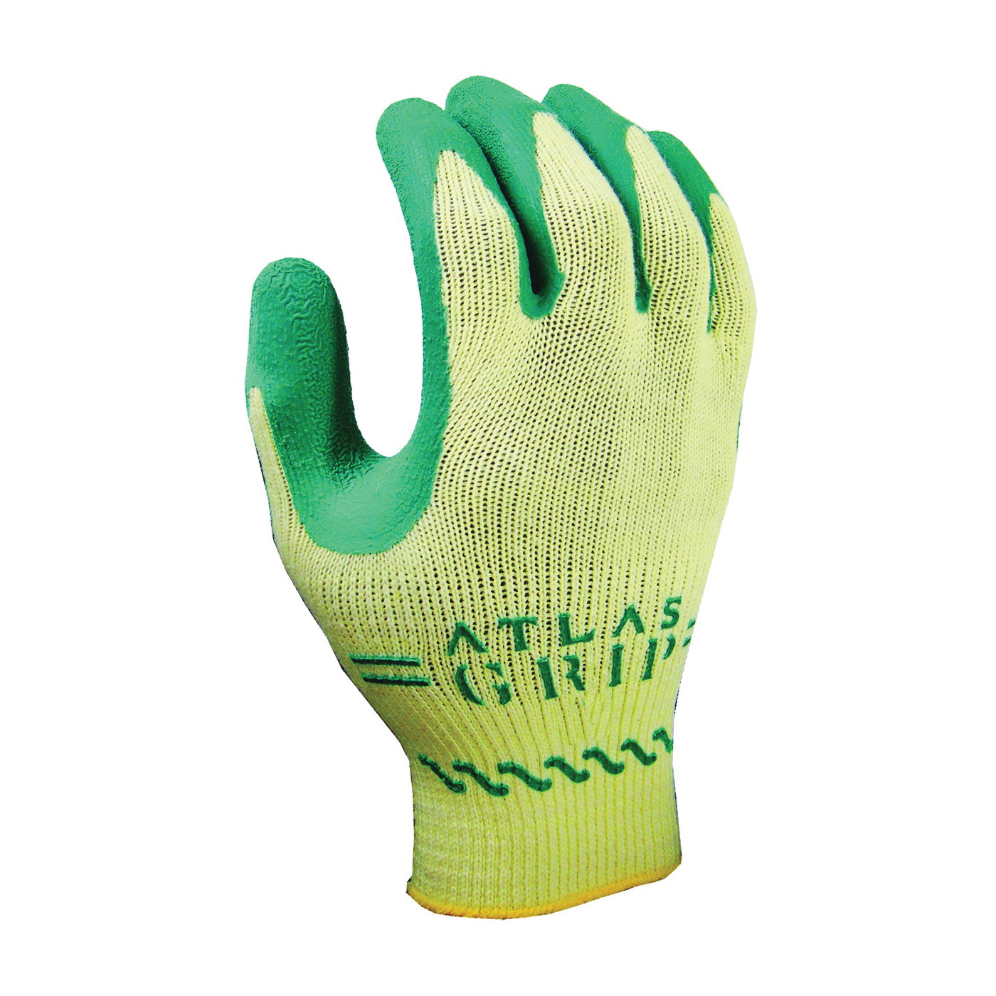 Same as 310 grip with kid-friendly tag, rugged natural rubber palm coating, comfortable 10 ga seamless knit, green on yellow, ergonomic design, machine washable, use for construction, gardening or yard work.