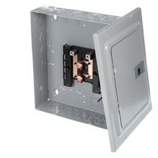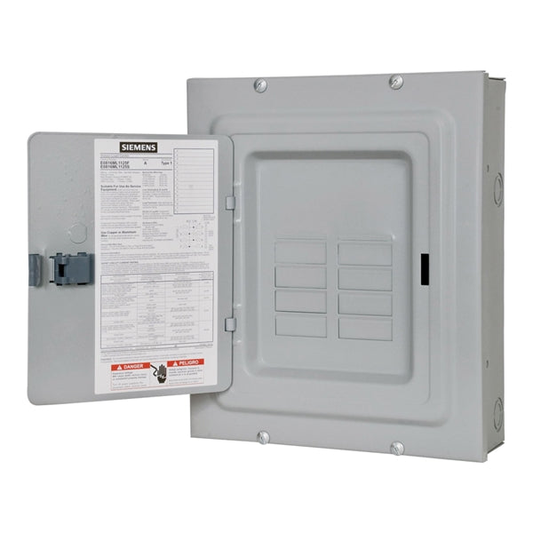 Code-gauge steel enclosure. Single phase, 3-wire, solid neutral, 8 spaces and 16 circuits maximum 1-pole, 4 QP breakers maximum 2-pole, 120/240 V. 10,000 AIR. One piece plated aluminum bus bar. 100% circuit breaker twist outs. Positive load side circuit breaker hook rail. Suitable for use as service entrance equipment when a main breaker (125 A maximum) is back-fed in branch position and used with main breaker retainer clip No MBR1. When used as service equipment, any unused neutral position may be used for equipment grounding. Rotate entire device 180 deg for bottom feed. Gray enamel finish. 12-3/8 in x 14-3/4 in x 3-7/8 in. UL listed, complies fully with NEC and UL requirements for Class CTL.