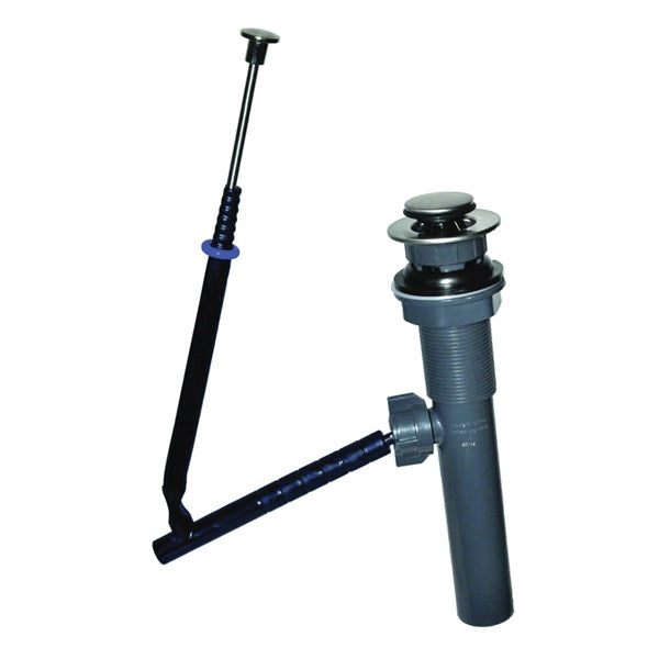 This Danco lavatory drain assembly comes complete with all the parts you need to replace the pop-up drain in your bathroom. Unlike ordinary drains, it features an EZ Connect tube that slides and wraps over the lift and lever rods which installs quickly and easily. No more hassle with taking the linkage rod apart to adjust and readjust the lift rod, it is as easy as just sliding the rods into the tube for the proper adjustment. It features a stopper that can be removed for cleaning with just a quarter turn. The brushed nickel stopper and trim is designed to fit into a Danco plastic drain body. The overall durable plastic construction provides reliable performance and the universal design will fit most bathroom sinks.