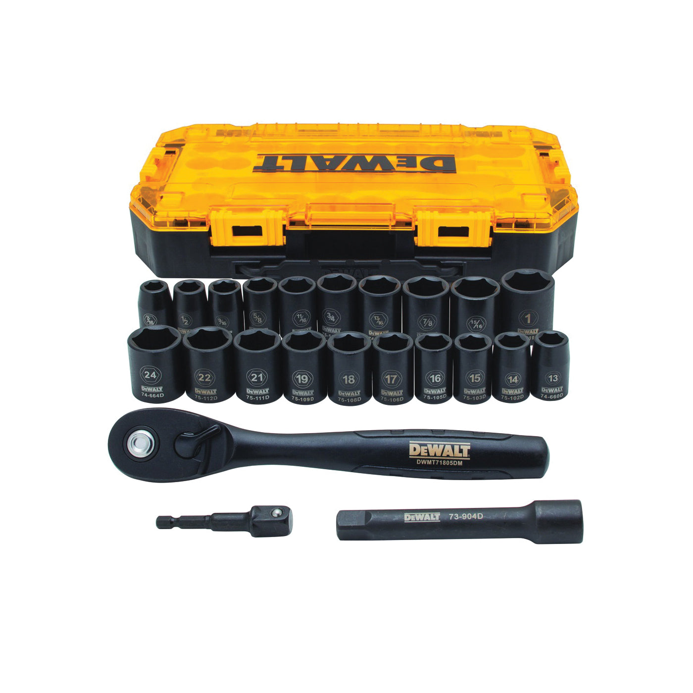 Heat-treated CR-440 steel. High visibility laser-etched markings. O-ring and retaining pin compatible. "DirectTorque" technology, black oxide coating. Set includes Metric: 13 mm, 14 mm, 15 mm, 16 mm, 17 mm, 18 mm, 19 mm, 21 mm, 22 mm and 24 mm, SAE: 7/16 in, 1/2 in, 9/16 in, 5/8 in, 11/16 in, 3/4 in, 13/16 in, 7/8 in, 15/16 in, 1/2 in drive 5 in impact extension, 1/2 in drive drill Adapter, 1/2 in drive quick-release ratchet with a lockable stacking case for easy storage.