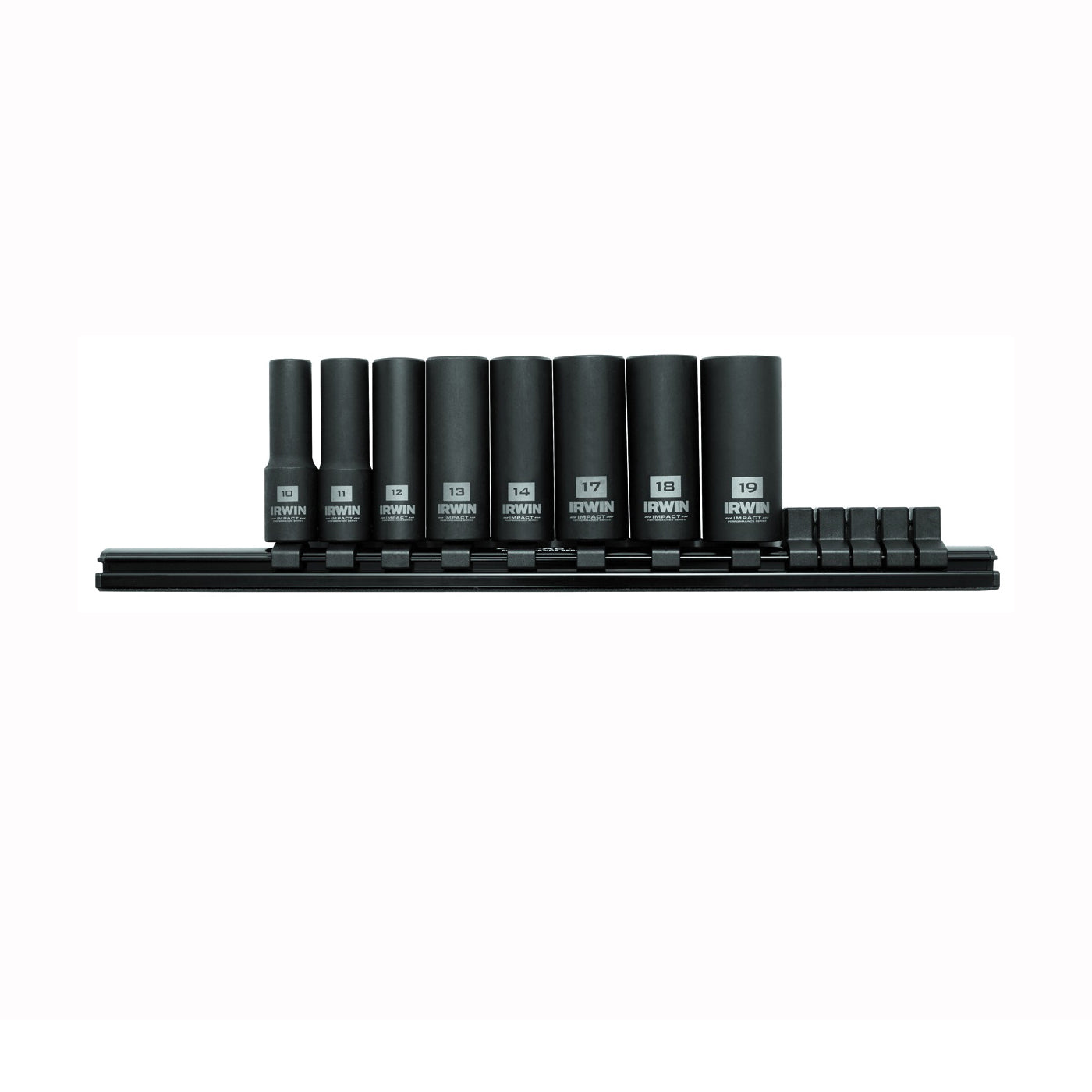 IRWIN Socket Rail Set, Impact, Specifications: 3/8 in Drive Size, Molybdenum Steel, Black Oxide, Number of Pieces: 8, Suitable for: 3/8 in Square Drive, Includes: 10mm, 11mm, 12mm, 13mm, 14mm, 17mm, 18mm, 19mm Socket