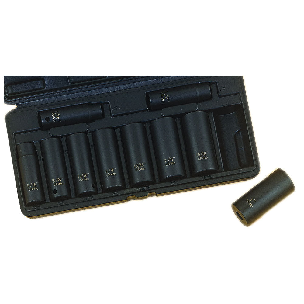 | Includes | 10 PCS:1/2 in Drive, 6 PT Deep Impact Socket - 7/16 in, 1/2 in, 9/16 in, 5/8 in, 11/16 in, 3/4 in, 13/16 in, 7/8 in, 15/16 in and 1 in |
