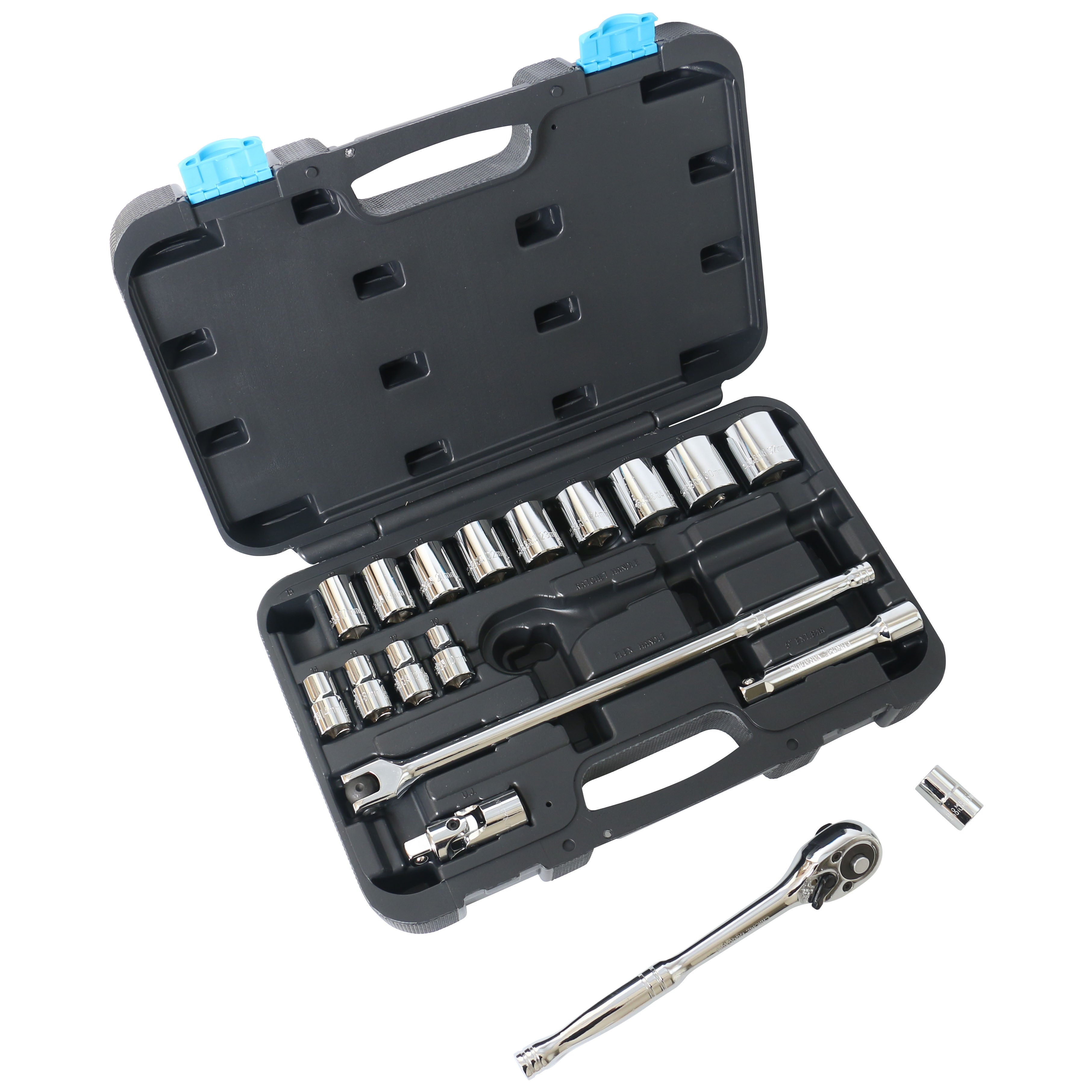 Includes 14 PCS: 1/2 in Drive 12 PT Standard Sockets - 10, 12, 13, 14, 15, 17, 19, 21, 22, 23, 24, 27, 30, 32 mm, 1 PC: 1/2 in Drive 10 in Quick Release Ratchet Handle, 1 PC: 1/2 in Drive 15 in Flex Handle, 1 PC: 1/2 in Drive Universal Joint, 1 PC: 1/2 in Drive 5 in Extension Bar and 1 PC: Blow Mold Case