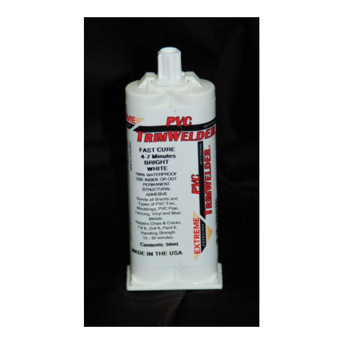 PVC TRIMWELDER fast cure adhesive is a rapid curing, two component adhesive formulated and colored for PVC trim board applications with a work life of 4 to 7 min at 70 deg F after mixing. It is a creamy, medium viscosity, solvent-free structural adhesive that is EPA and CARB compliant. Cured performance shows excellent adhesion and bond strength. Adhesive joints are ready to handle in 10 to 30 min. PVC TrimWelder fast cure adhesive does not require special surface preparation. It's stronger then PVC after curing and fills gaps to 1/8 in. fast cure actually reinforces core to core joints without the need for fasteners or biscuits. The creamy consistency, won't foam, run or drip and is well suited to seal and smooth cut edges for a finished look. Excellent sandability after curing.