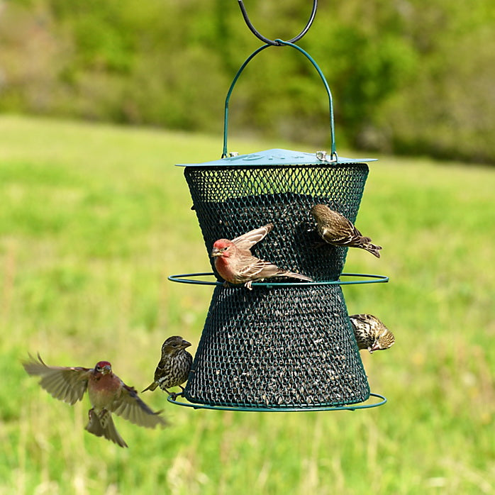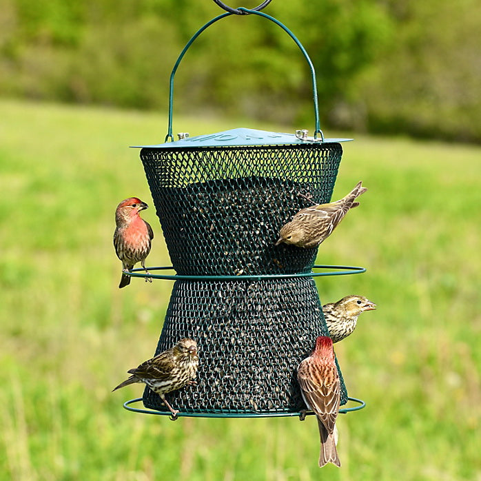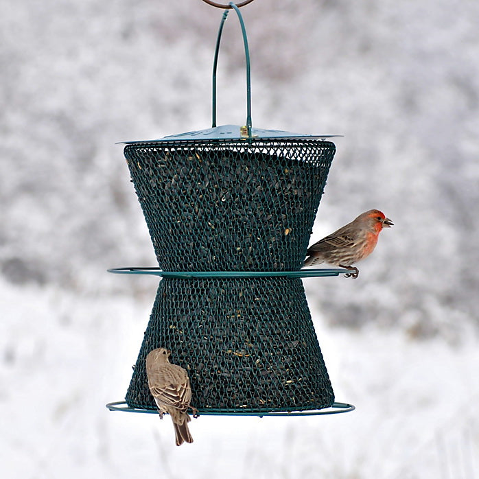 The Hourglass® Perky-Pet® wild bird feeder, in a classic forest green finish, is a large capacity feeder that will attract a wide variety of birds to your yard. Enjoy hours and hours watching the many birds that dine at this long-lasting and high-quality feeder. Without the use of plastic or wood components, the all-over metal mesh construction of the Hourglass® Perky-Pet® feeder stands up against squirrels and other small animals that may try to access birdseed. The mesh also makes the perfect landing place for clinging birds, while perching birds appreciate the two available perches. The Perky-Pet® Hourglass® wild bird feeder holds an enormous 6 lb of black oil sunflower seed, the most popular seed among backyard birds. The ability to accommodate up to 20 birds at once makes the Hourglass® Perky-Pet® wild bird feeder a must-have feeder for backyard birding.