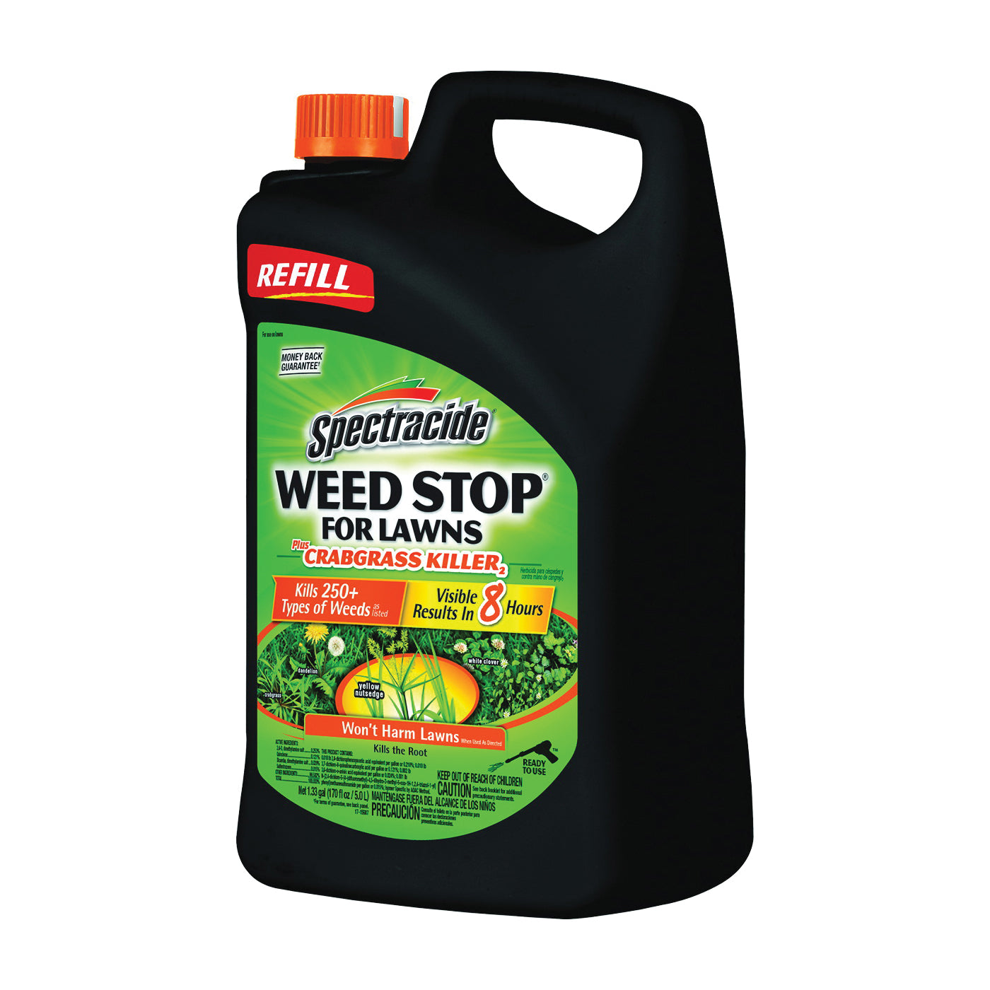 Use Spectracide® weed stop for lawns plus crabgrass killer2 (AccuShot Refill) to kill over 250 types of weeds as listed, including crabgrass. The product produces visible results in 8 hrs. This product kills broadleaf and troublesome grass weeds including dandelion, chickweed and clover as well as crabgrass, foxtail and yellow nutsedge, see product label for complete list of weed types.