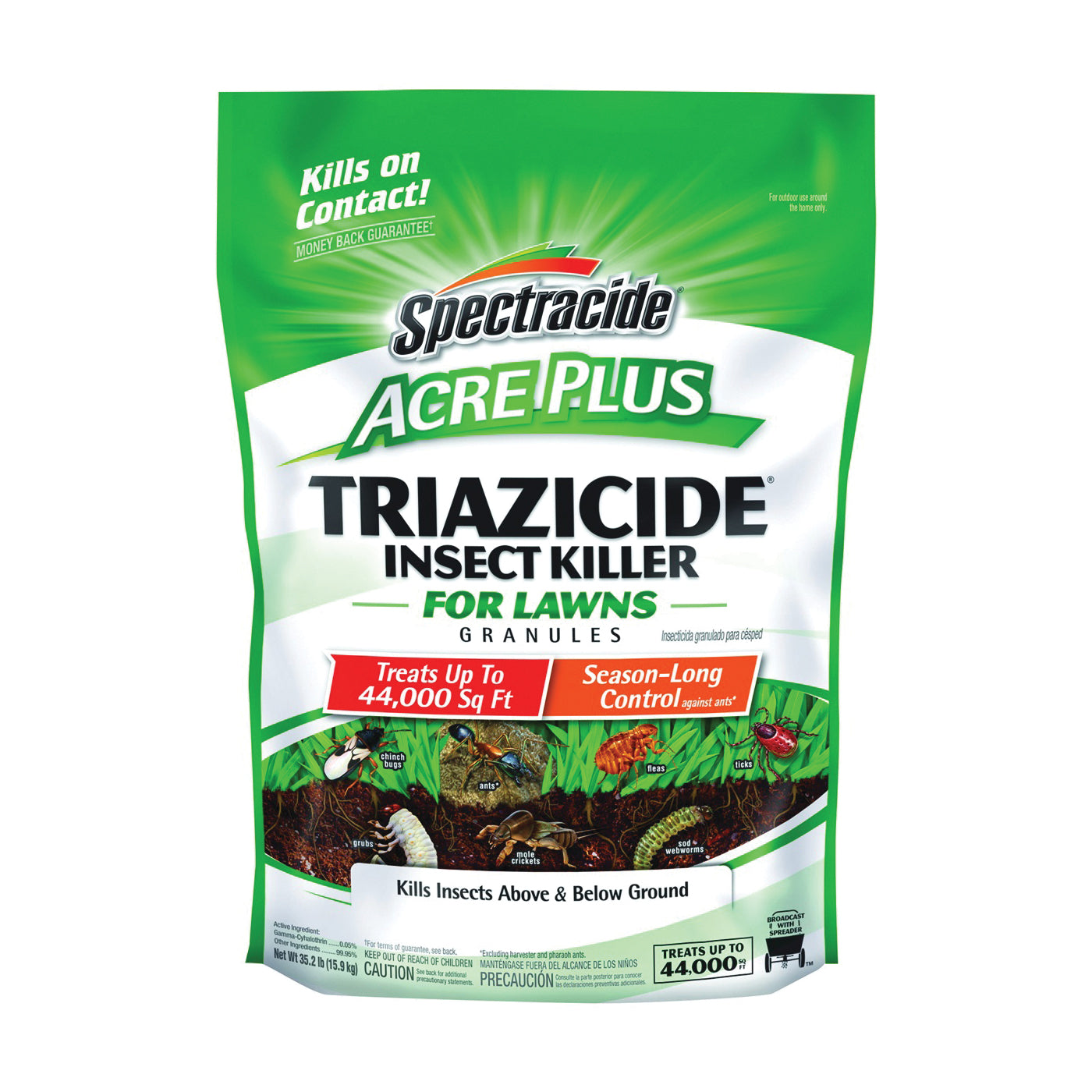Spectracide® Triazicide insect killer for lawns granules kills 100 plus types of lawn-damaging as listed. It kills insects on contact above and below the ground, including ants, crickets, centipedes, pill bugs, fleas and grubs. Apply with a broadcast or rotary spreader to the lawn. It is formulated for broad-spectrum control of insects in home lawns, spot treatment and for use as a barrier band treatment around your home.