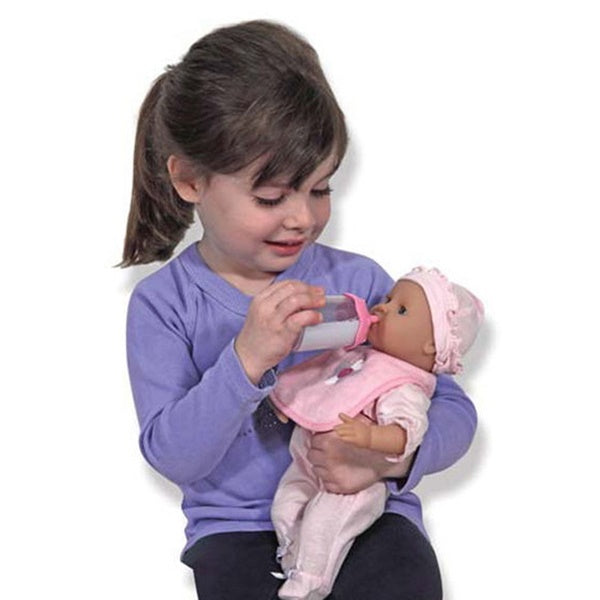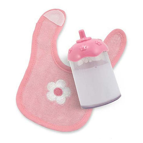Take good care of baby dolls with this charming feeding set. Prepare baby for mealtime by fastening the self-stick, embroidered bib. Little ones will be fascinated to see the milk disappear from the bottle as baby drinks and makes it all gone.