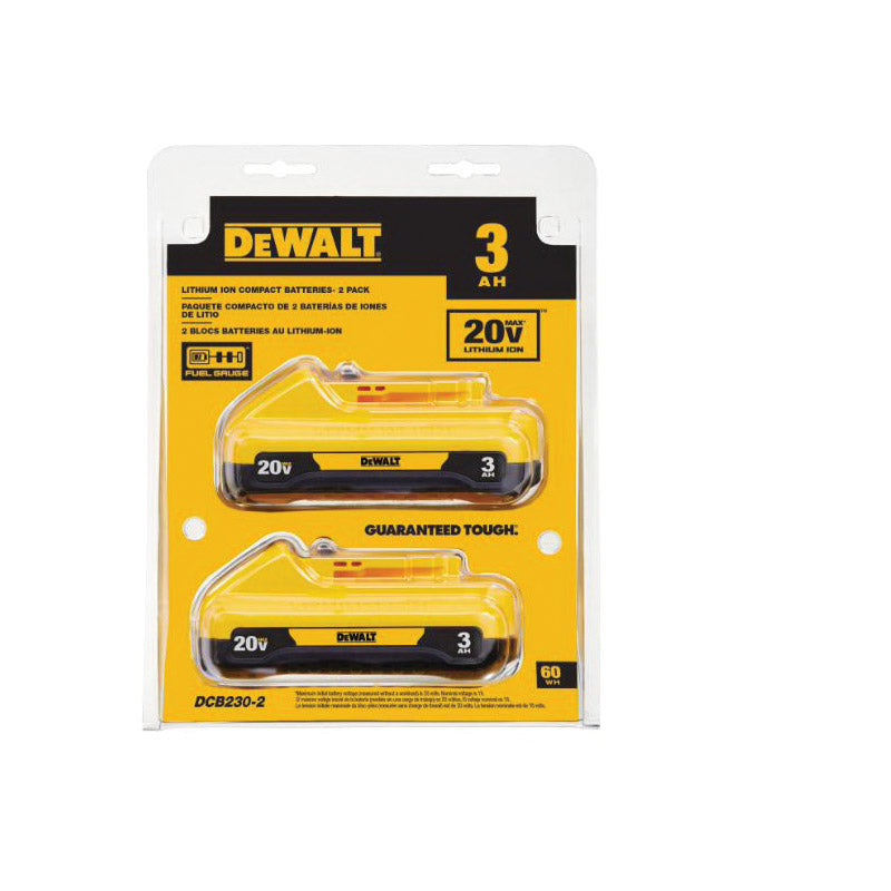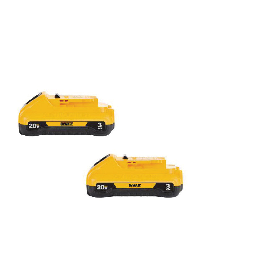 This 20 V maximum 3 Ah battery two-pack gives you a pair of our high-capacity compact 20 V maximum batteries. They provide 3 Ah capacity with reduced weight, giving you optimum comfort for extended power tool use. It includes a three-LED fuel gauge system to instantly check battery state of charge. This battery is compatible with all DeWALT 20 V maximum power tools and includes 3 Year limited warranty.