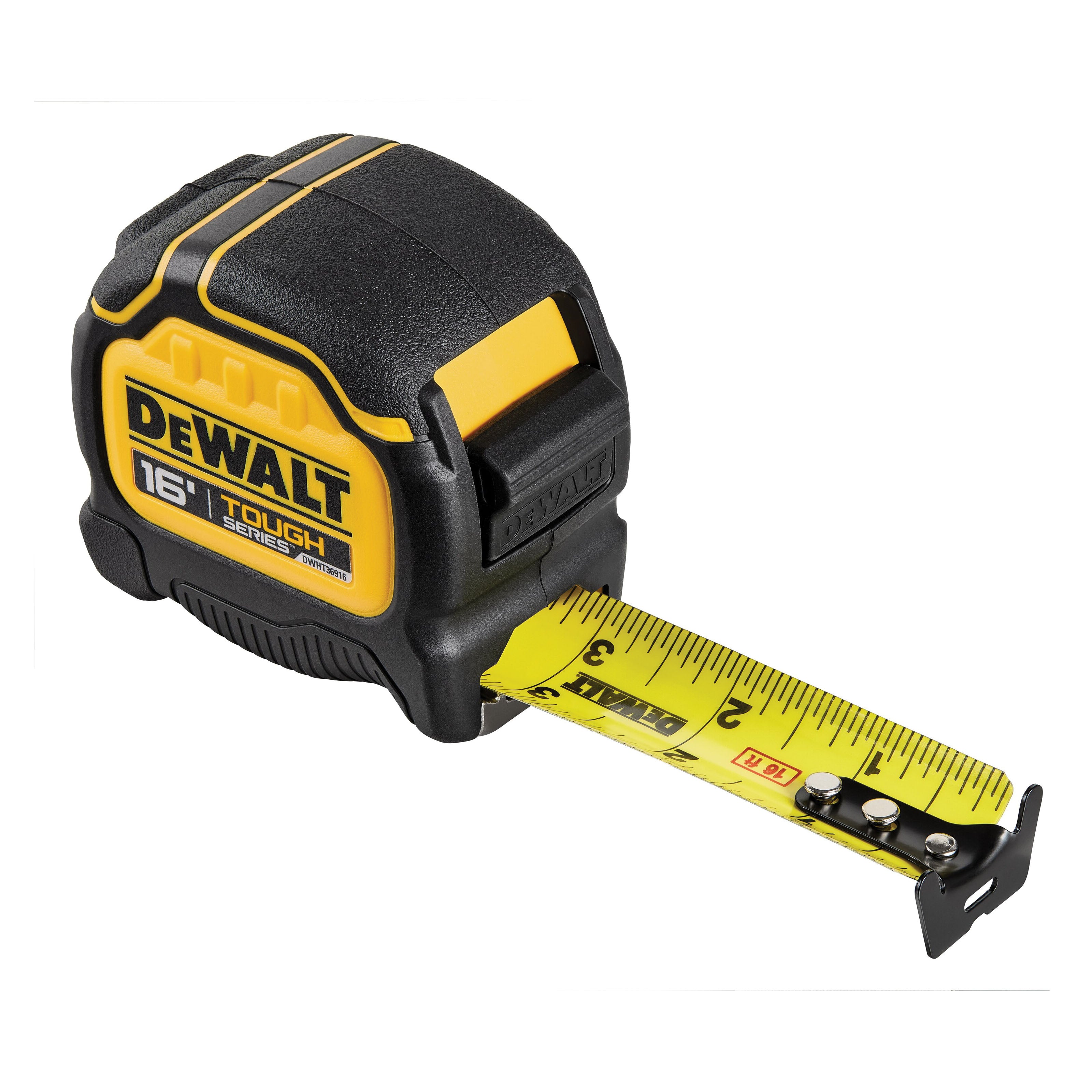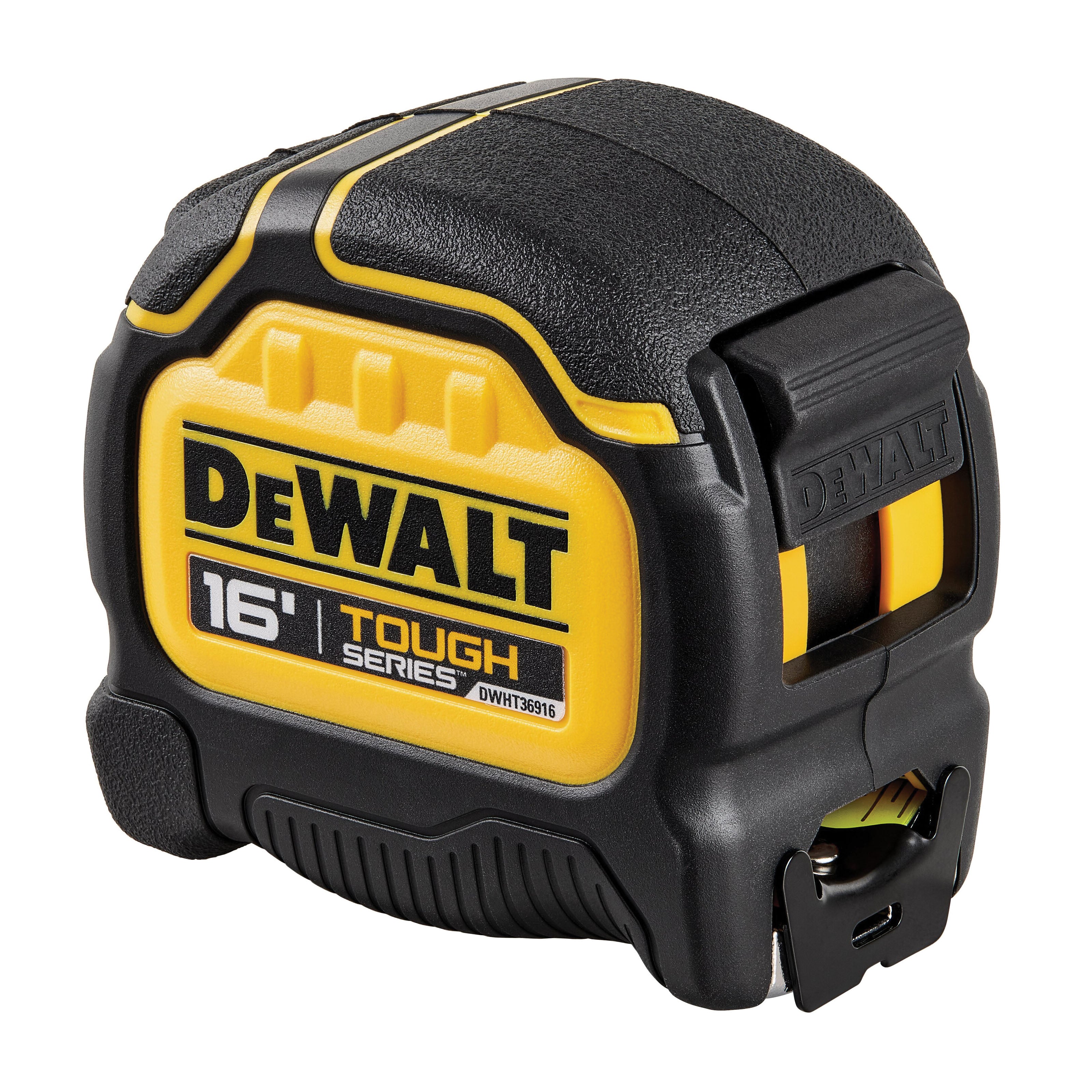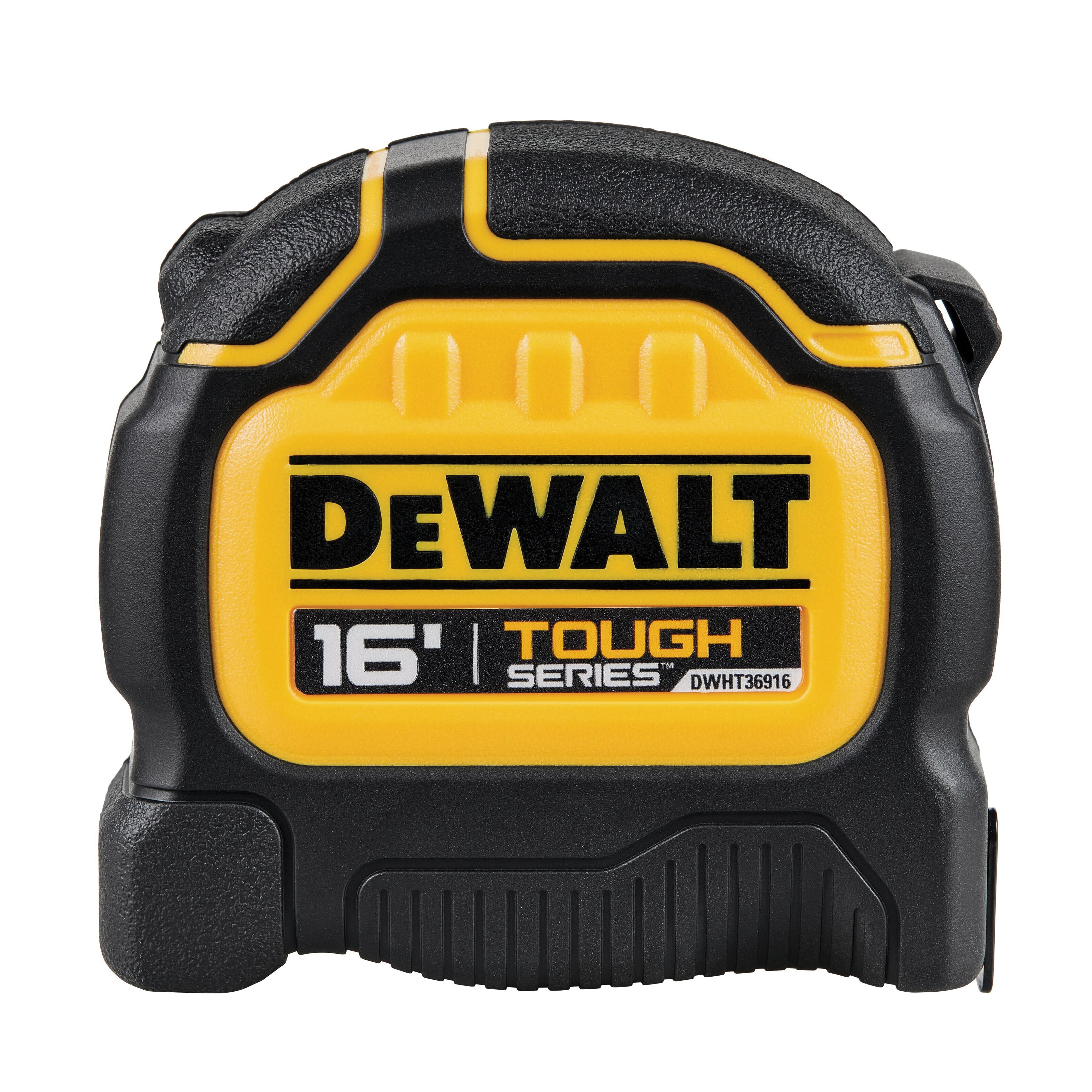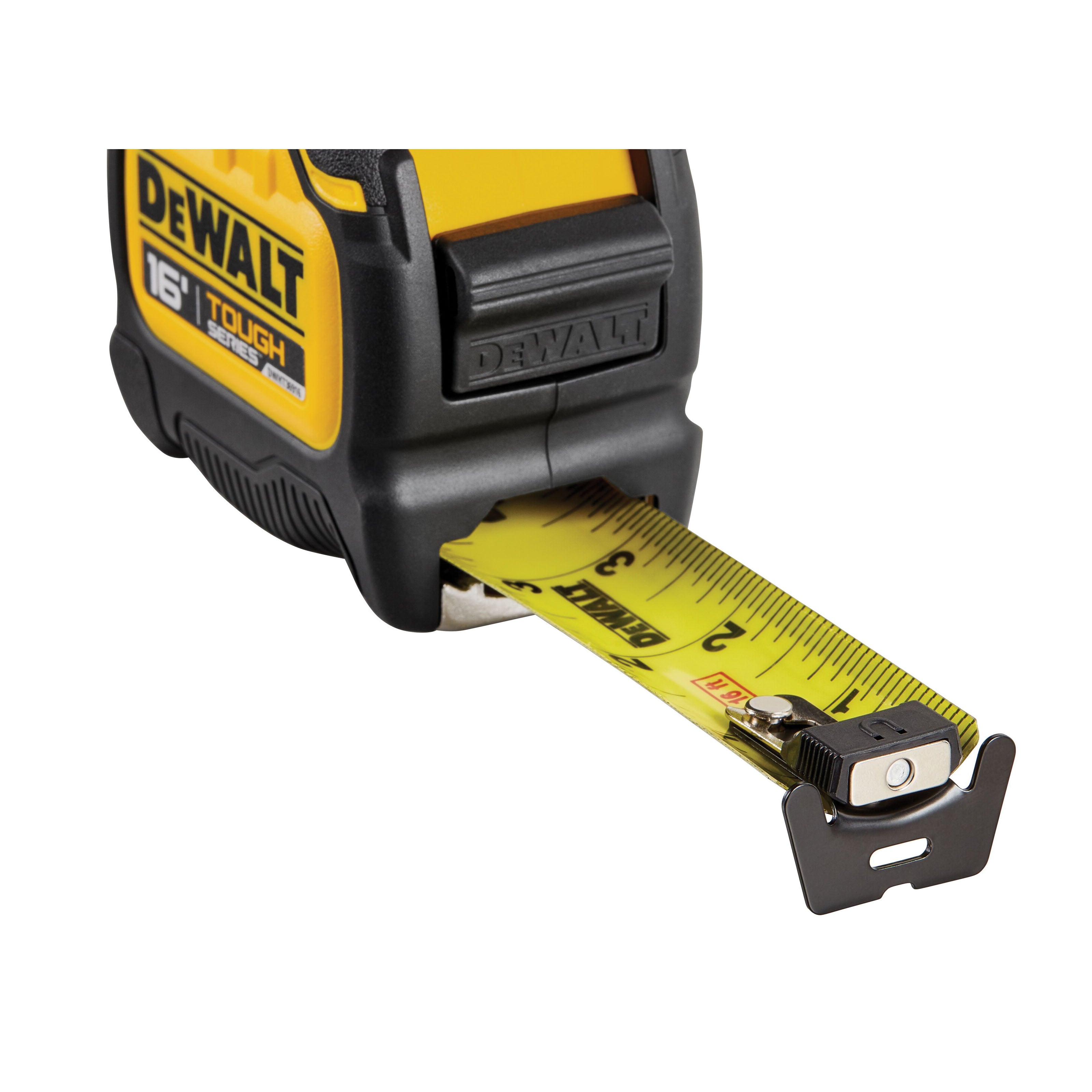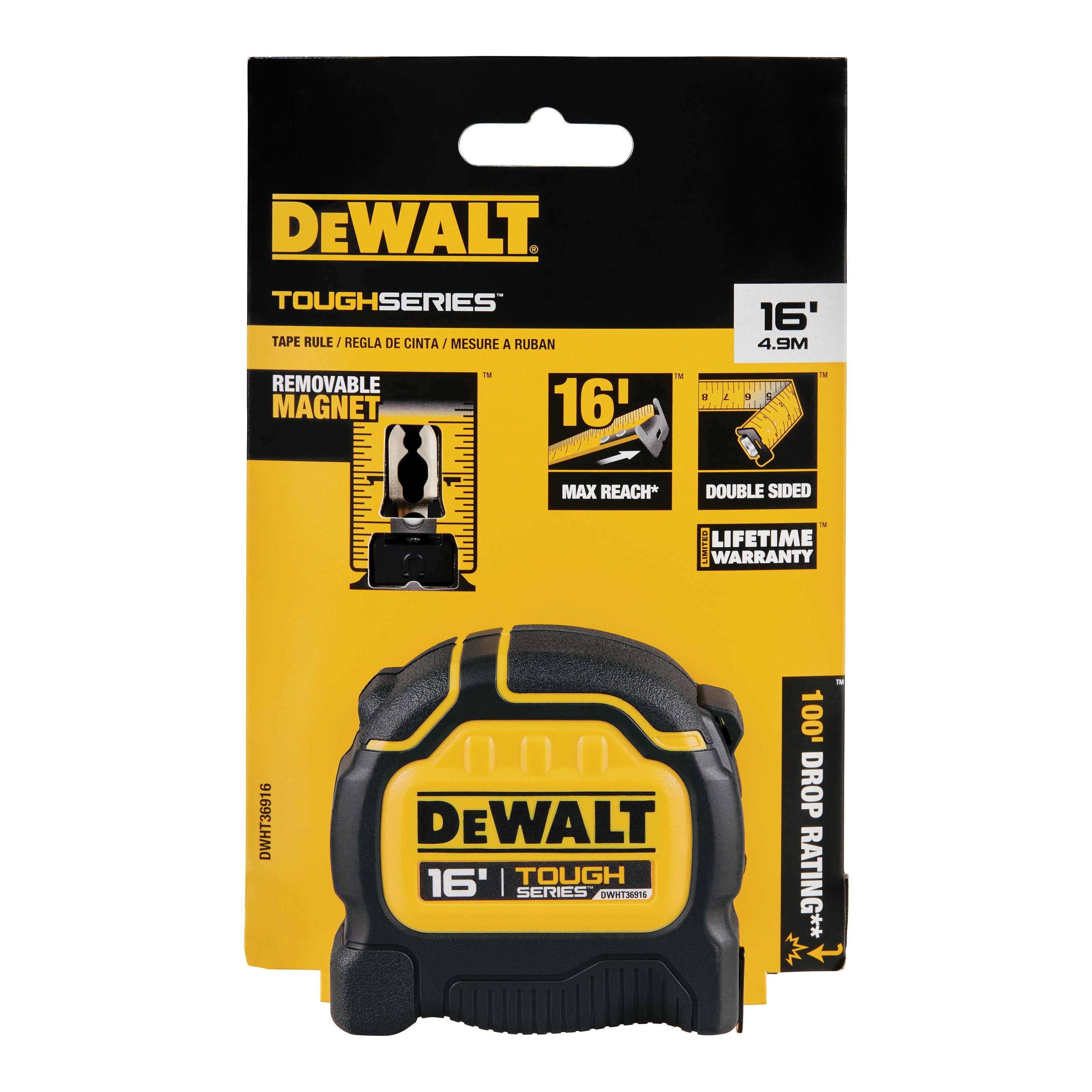 Able to survive drops up to 100 ft, this ToughSeries™ 16 ft tape measure is the model choice for toughness. Easily execute long measurements without assistance with 16 ft of max reach. Versatile ToughSeries™ tape measures allow you to conveniently measure from any angle and are the first in the DEWALT family to have double-sided print. Efficiently measure metal objects with a removable hook magnet while patented hook connection technology offers full control as you work. Defend against product wear-and-tear with the 16 ft tape measure hook's 6 in Rip-Shield™ blade coating while the protective covering delivers optimized durability.
