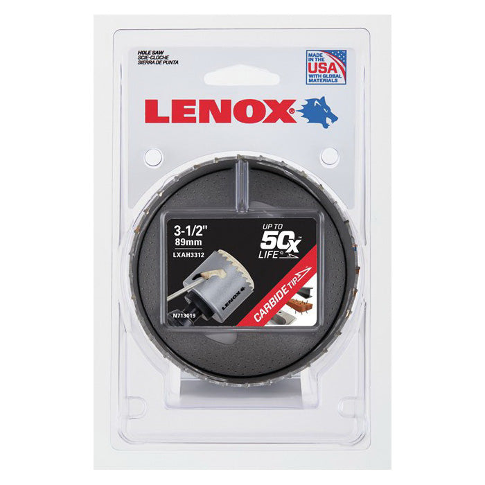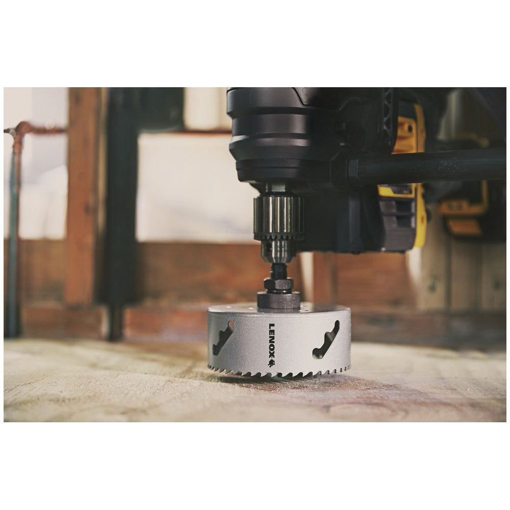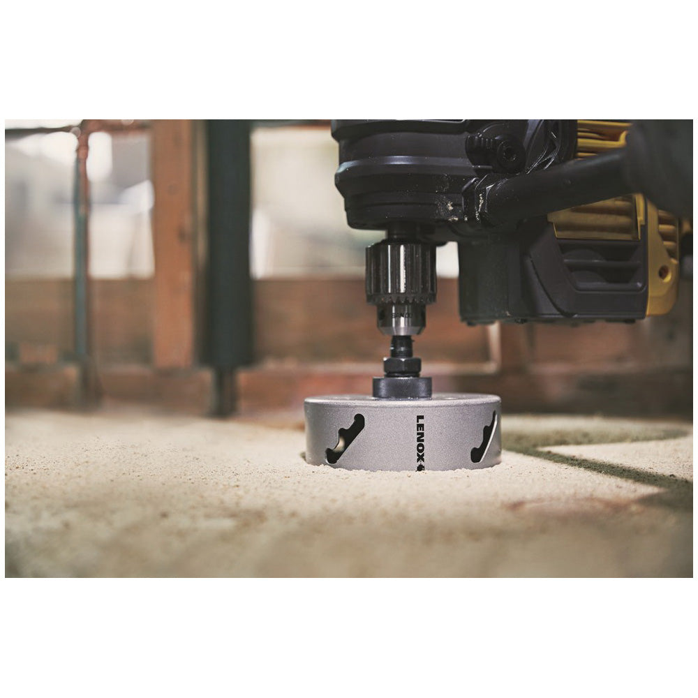 Lenox Speed Slot Hole Saw, 400 rpm Aluminum, 140 rpm Stainless Steel, 50 rpm Fiber Glass, 110 rpm Ceramic Tile, 50 rpm Iron Speed, 3-1/2 in Diameter, Carbide Cutting Edge, Applicable Materials: Abrasives, Cast Iron, Stainless Steel, Steel, Wood, Suitable for: Snap-Back 2L, 6L Arbor Models