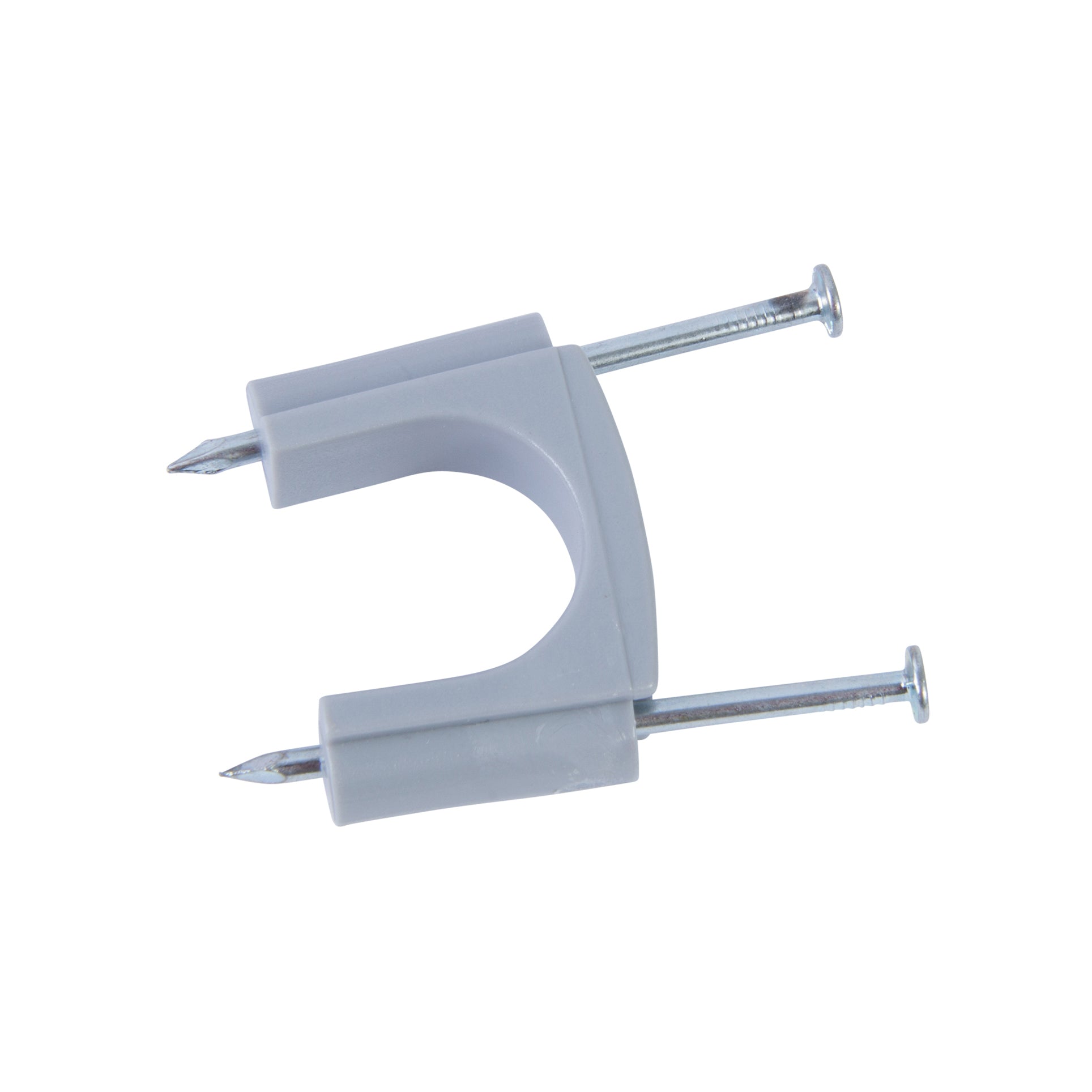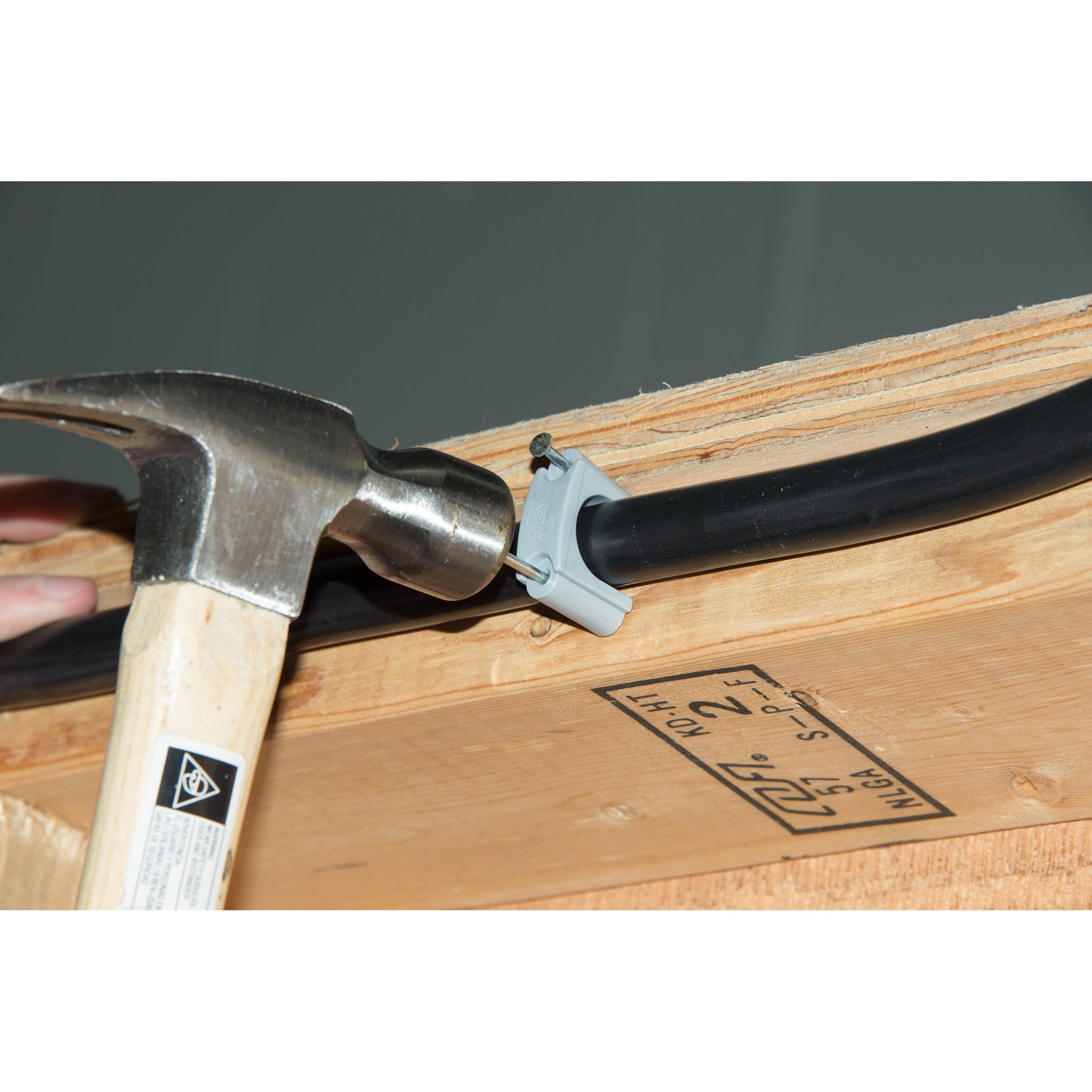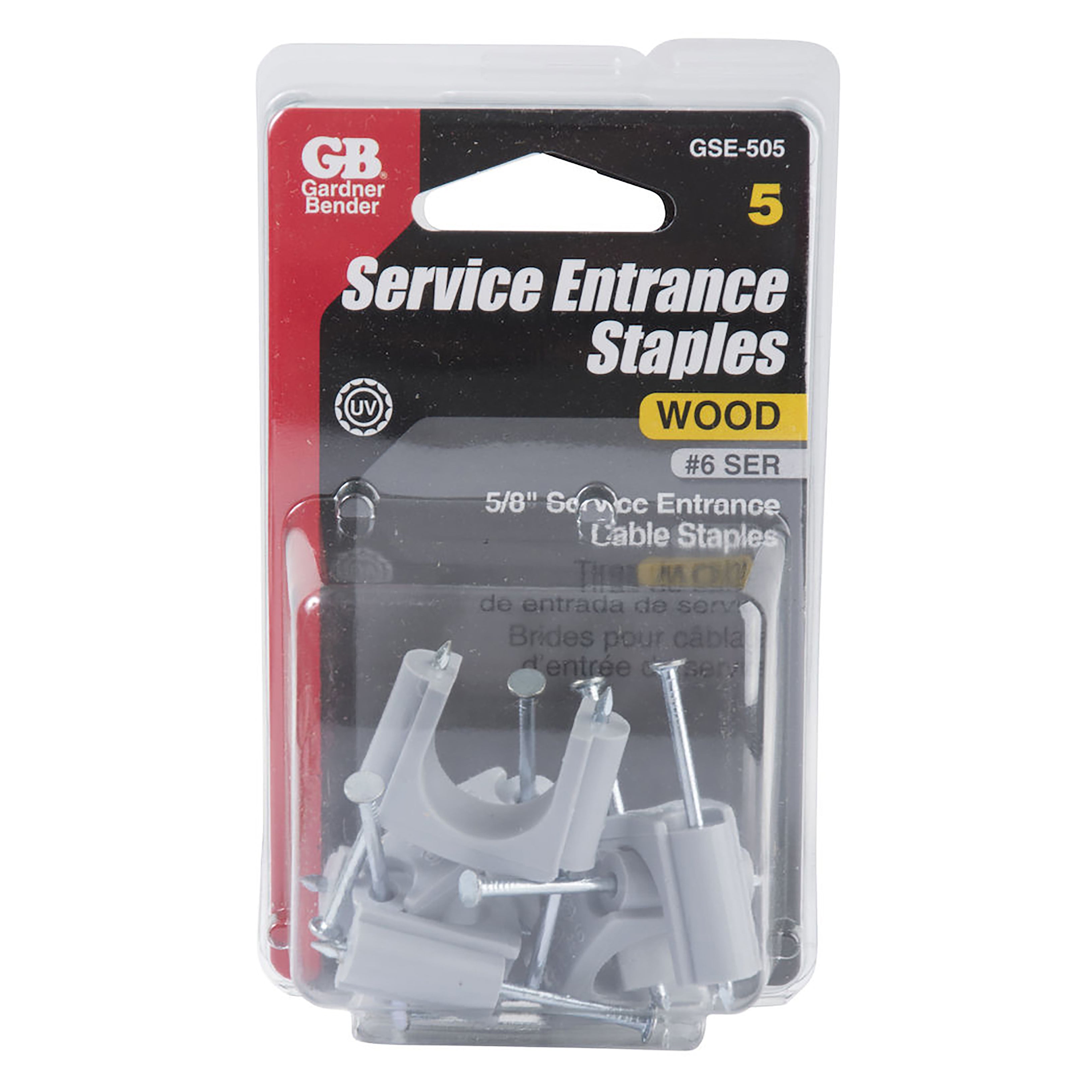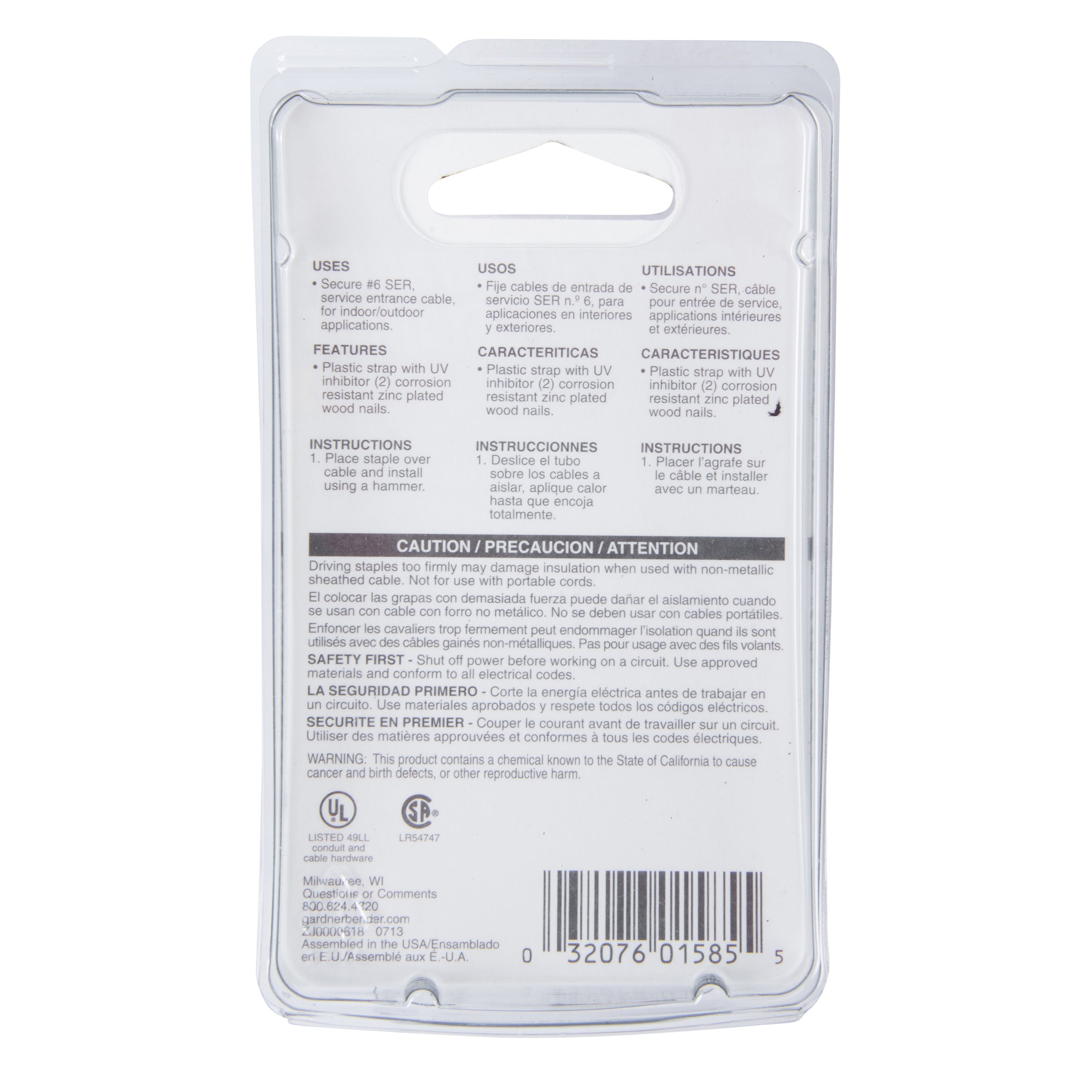 Service entrance cable strap or staple designed for securing larger sized electrical cable onto wood surfaces. Stabilized polyethylene saddle withstands both extreme cold and UV rays without cracking or deteriorating. Designed to cradle and protect delicate cable insulation during installation. Zinc-plated nails resist rust and corrosion and recess fully into the strap to eliminate snags. Secures NO 6 SER service entrance cable. Assembled in USA with components from USA and China.