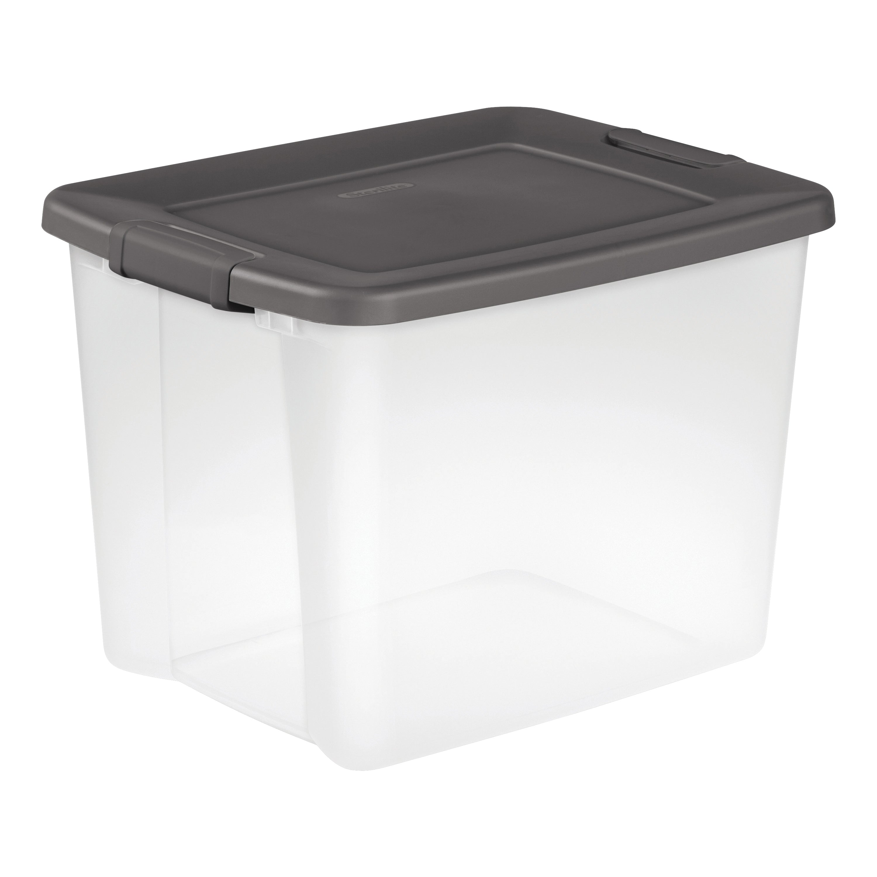 The 50 qt shelf totes is designed to fit on Sterilite's 5-shelf ventilated shelving unit to maximize the vertical space in a garage or basement setting. The 50 qt version equals the height of a two 25 qt shelf totes stacked to optimize storage space and present a neat appearance. Shelf totes are stackable, include integrated handles for comfortable carrying and feature durable latches to ensure that contents remain in place.