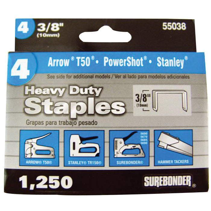 Surebonder 55038 heavy-duty 3/8 in length staples, Arrow T50-type, 1250 per box. Surebonder staples will meet all of your stapling needs. Our staples are designed for use with Surebonder staple guns and many of the other top name brand staple guns. ANSI Z87.1 always wear safety glasses.
