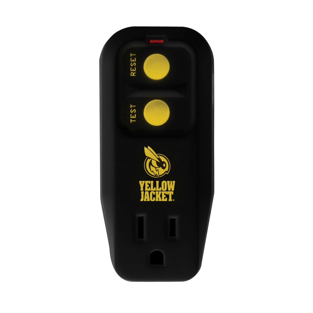 Grounded single outlet adapter detects power leaks and shuts off electricity in less than a second to prevent shock. Test and reset buttons.