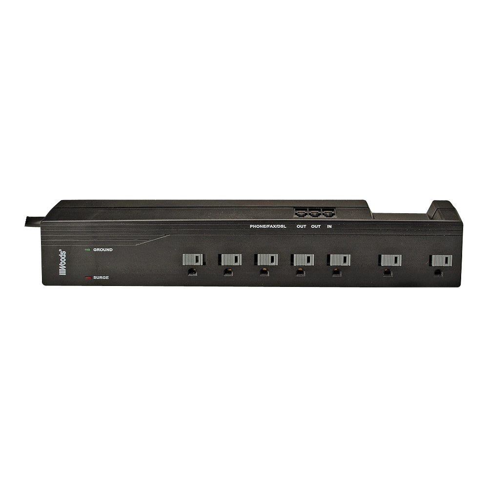 These 7-outlet surge protectors include 2 transformer outlets, sliding safety covers, surge protection indicator, ground indicator, right angle plug, lit reset on/off power/15 A circuit breaker switch and EMI/RFI noise filtration.