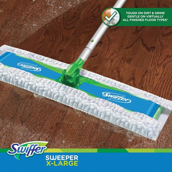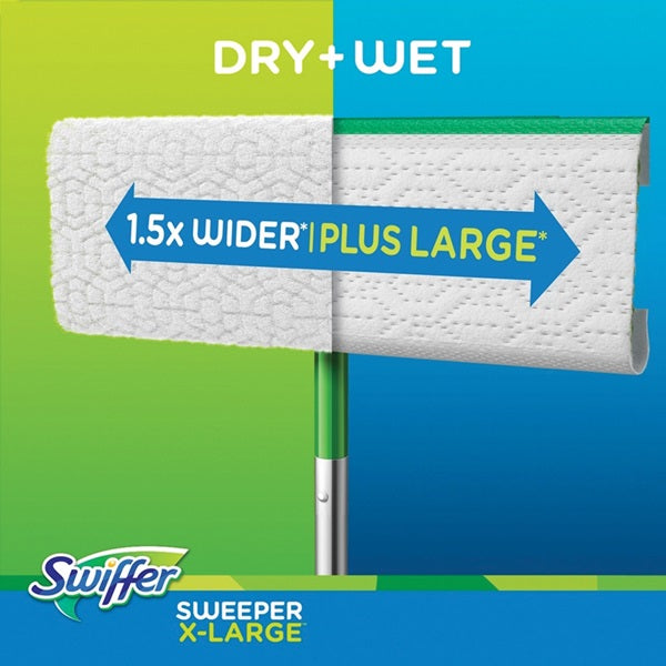 This 1.5X wider than regular Swiffer® Sweeper®, it covers more ground so you don't have to. Great for large areas and big projects. It uses extra-large thick dry cloths that trap and lock dirt, dust and hair. You can also use two Swiffer® Sweeper® wet cloths to tackle dirt and grime.