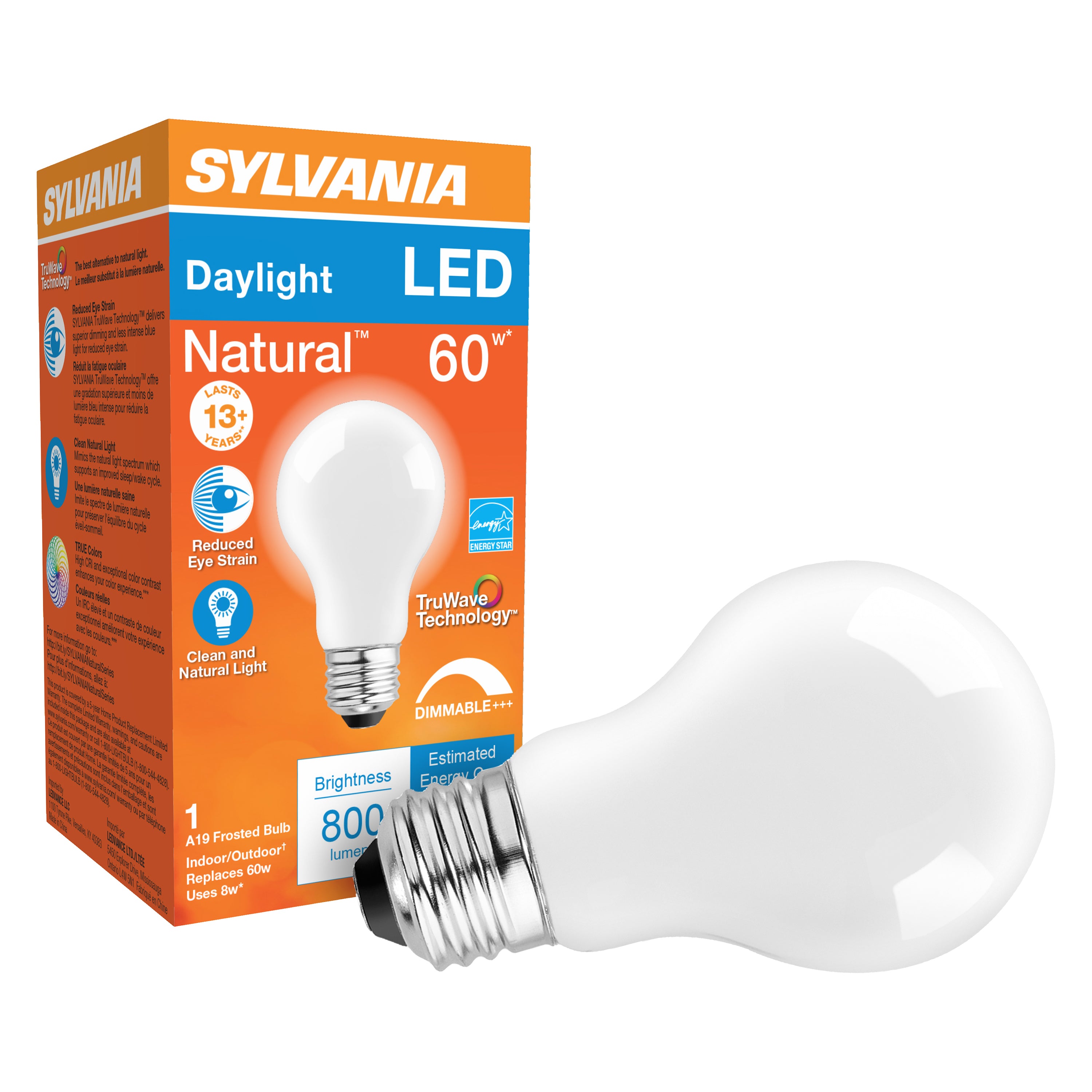 Sylvania LED Bulb, General Purpose, Wattage Rating: 8 W, 120 V, Lamp Base: E26, Lamp Shape: A19, Dimmable: Dimmable, Light Color: Daylight, Color Temperature: 5000 K, Color Rendering Index (CRI): 82, Average Life: 15,000 hr