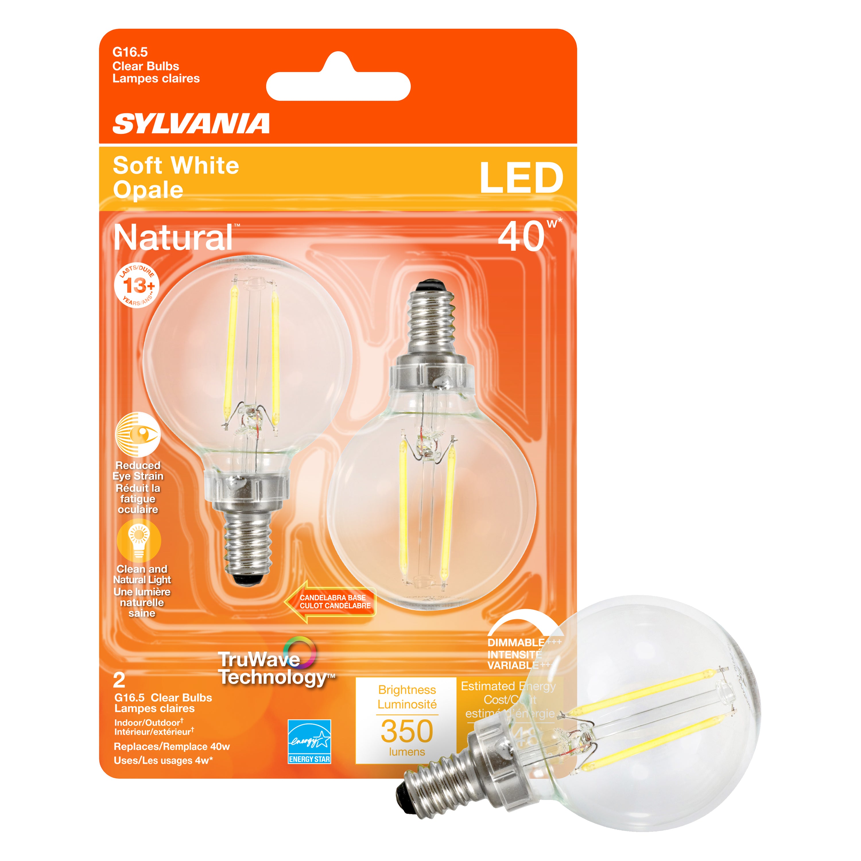• Sylvania 40784 Natural LED Bulb, Decorative, G16.5 Lamp, 40 W Equivalent, E12 Lamp Base, Dimmable, Clear