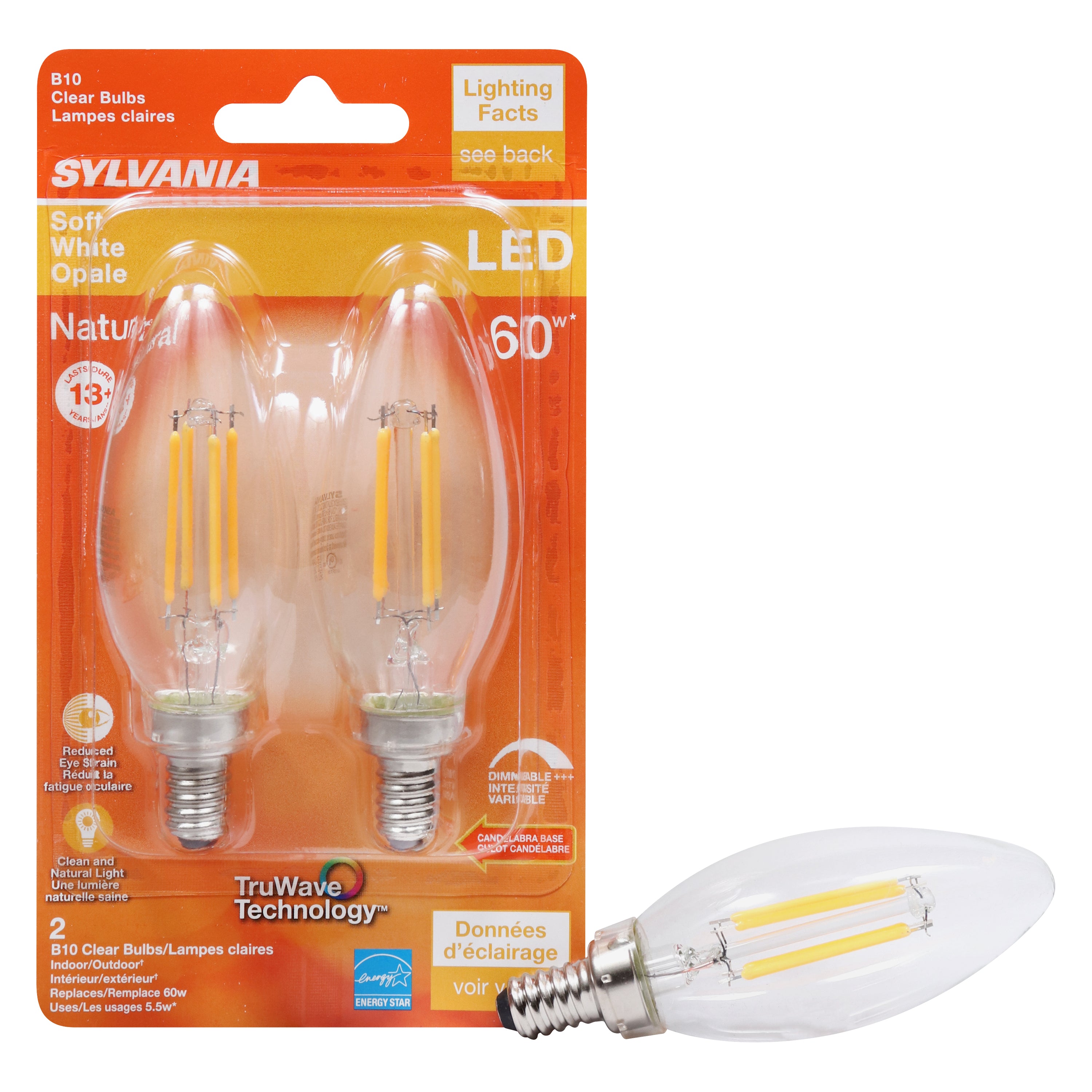 • Sylvania 40796 Natural LED Bulb, Decorative, B10 Blunt Tip Lamp, 60 W Equivalent, E12 Lamp Base, Dimmable, Clear