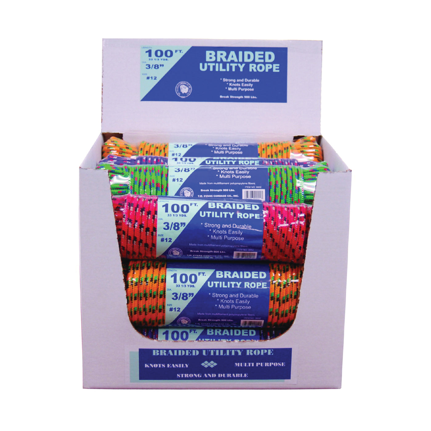 Braided utility rope, strong, durable multi-purpose and knots easily. Assorted colors.