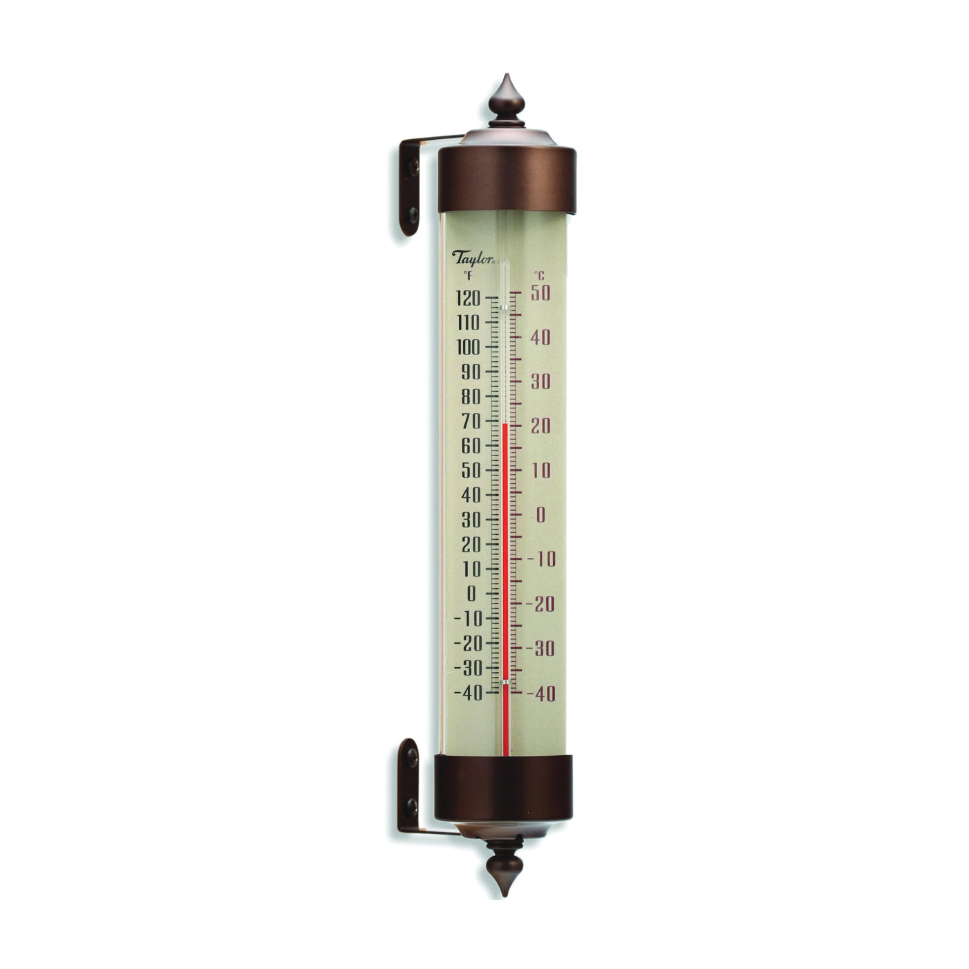Keep up with the weather in style. The traditionally-styled TAYLOR 12-1/4 in long glass tube dial thermometer accurately measures indoor and outdoor temperatures and is a part of TAYLOR's esteemed Heritage collection.