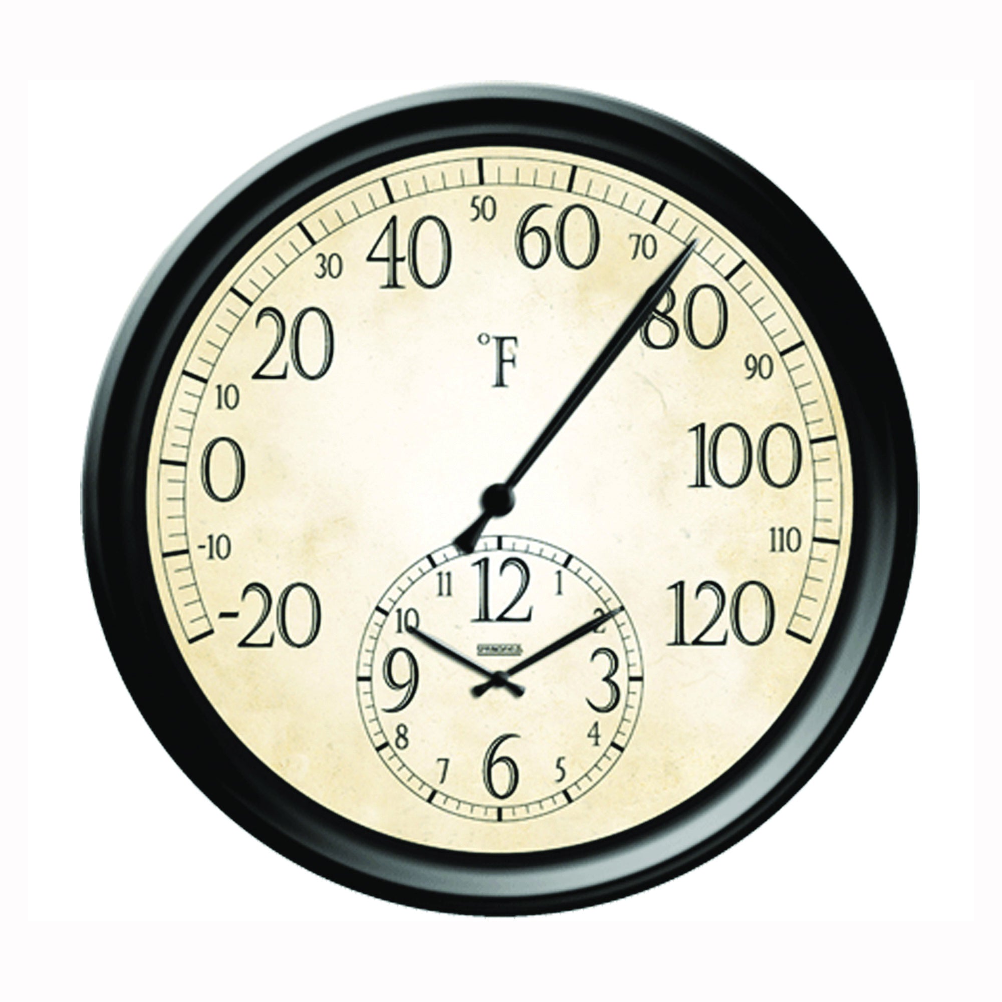 The graceful design of the Springfield 91575 thermometer/clock combo makes it easy to pair with any style of indoor and outdoor decor. The combo has a 14 in dial with bold numerals, making it easy to read without sacrificing any of its sophisticated charms. It employs a fade- and weather-resistant coating, ensuring that its colors will remain as attractive and true as the day they were applied.