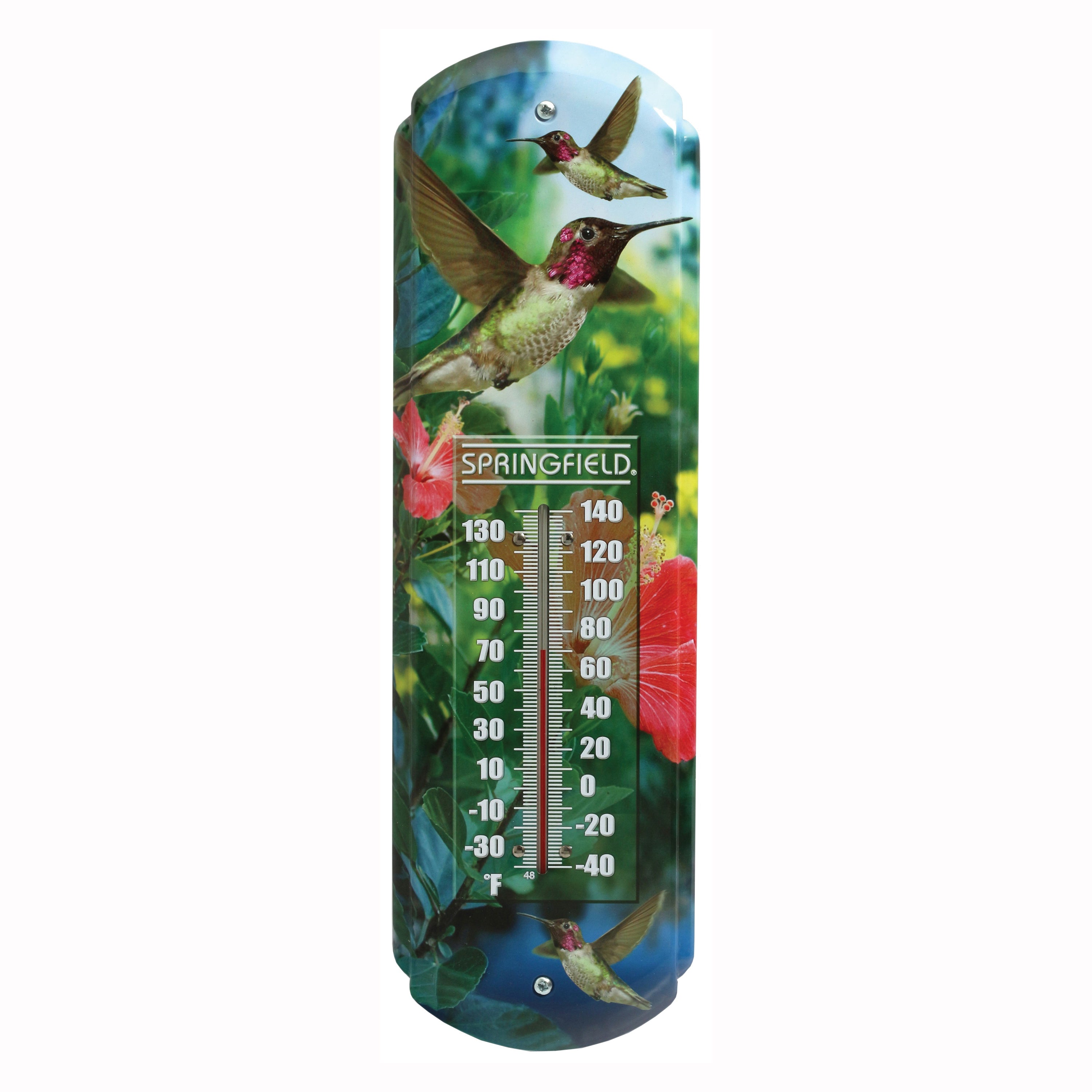 Metal thermometer with tomatoes artwork. Temperature range of -40 to 140 deg F. Durable, fade-resistant finish. Glass spirit-filled thermometer tube. Hang with screws or nails (not included). Measures 17 in H x 5 in W.