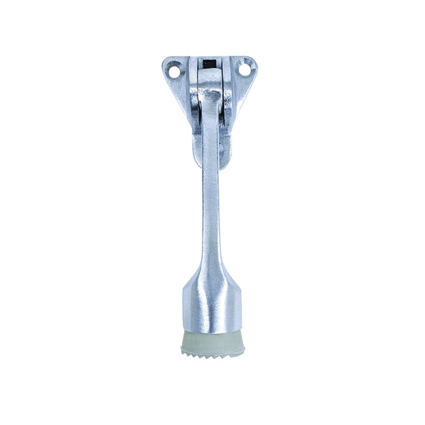 Kick down door holder with 4 hole backplate. rectangular base secures to door. Replaceable rubber tip for non-marring grip on floor surface. 4 in L.