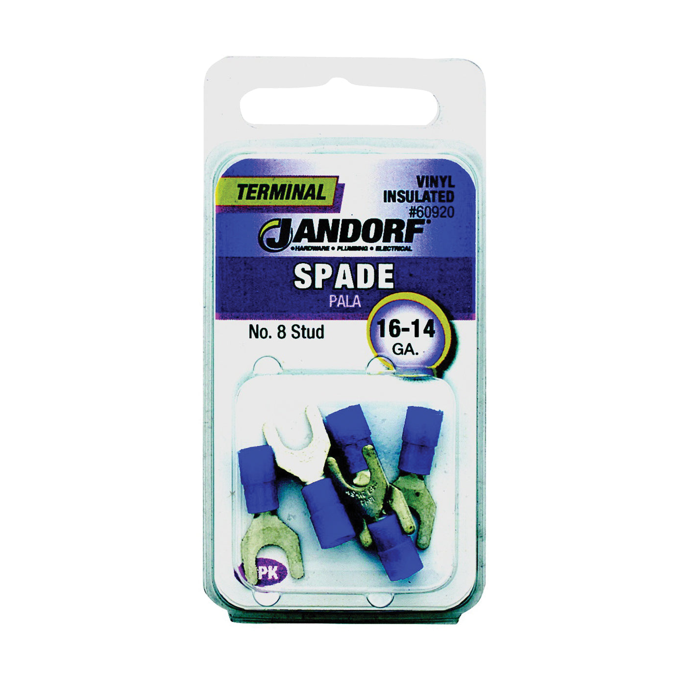 Jandorf Spade Terminal, 600 V, Wire Size: 16 to 14 AWG, Insulation Material: Vinyl, Contact Material: Copper, Contact Coating: Tin, Stud Size: #8, Blue