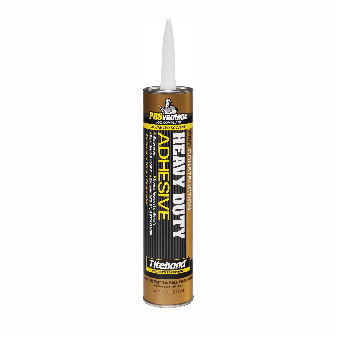 PROvantage™ PRO Heavy-duty adhesive is a premium-grade formula designed for more demanding construction and repair projects. It is ideal for bonding most common materials including wood, metal, brick, marble, ceramic tile, concrete, drywall and wet, frozen and treated lumber. PRO Heavy-duty adhesive meets today's most stringent state and Federal VOC regulatory requirements. It fills gaps between materials, reduces the amount of nailing and can be extruded down to 0 deg F.