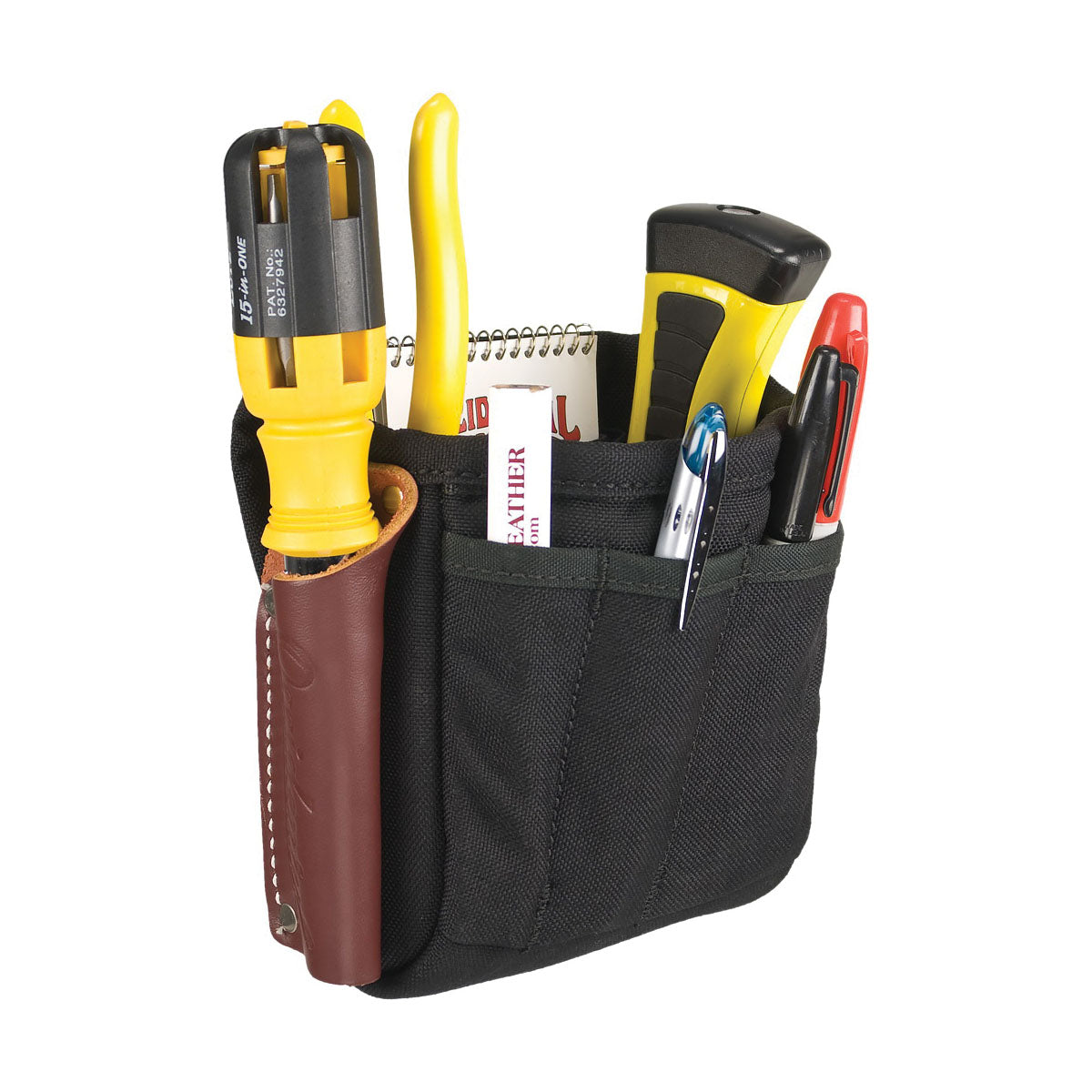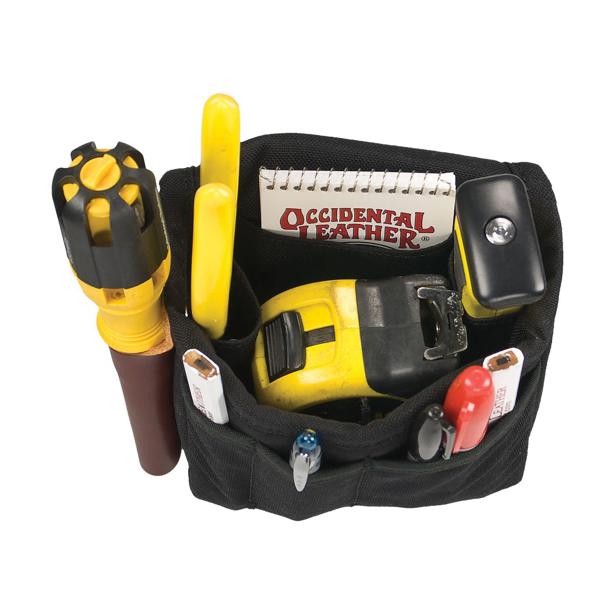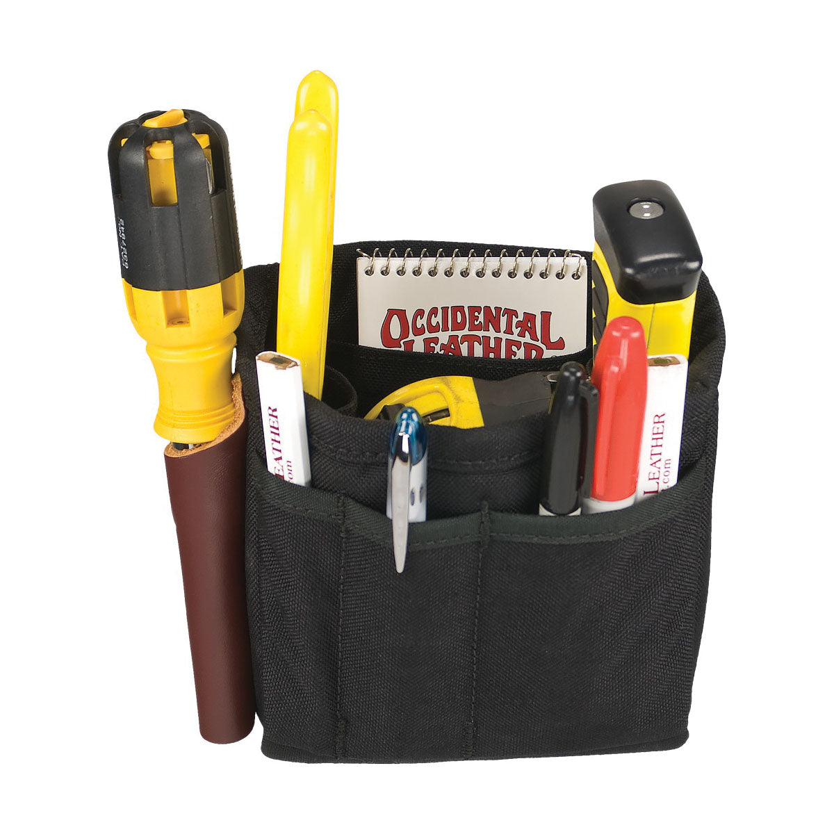 Occidental's task pouch provides holders for your tape measure, spiral pad, pens and pencils, screw driver, utility knife and pliers. Accepts a 2 in work belt. Made in the USA of our industrial 2-ply Cordura fabric with a foam core.