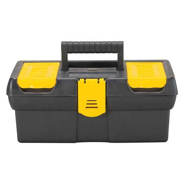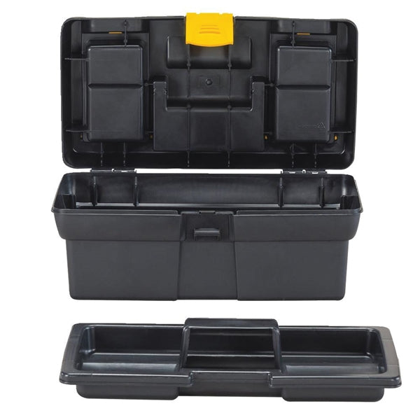 Two lid organizers for small parts storage, accessible without opening the tool box. Built-in pad lock eye for small locks to keep contents secure. Soft, wide rubber-coated handle allows for easy and comfortable grip. Tote tray inside to store smaller items.