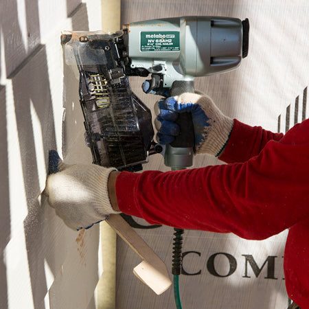 The coil siding nailer offers the precision, power and features pros demands for applying siding, sheathing, decking and fencing. The first nail gun, using air pressure to propel a nail, was first introduced in the 1950s to increase the speed of sheathing and sub-floors for house construction. These days, siding nailers are common tools of professional construction professionals. The Metabo HPT Siding Nailer is capable of driving nails as large as 2-1/2 x 0.099 in at a rate of 3 per second, the NV65AH2 is both powerful and efficient. With added features like a selective actuation switch, side-load tilt bottom magazine and repositioned depth of drive adjustment dial, this professional Siding Nailer gets even better. Additional features such as the adjustable air deflector, no-mar nose cap and plastic shield add convenience and the ability to use both wire or plastic sheet nails creates flexibility.