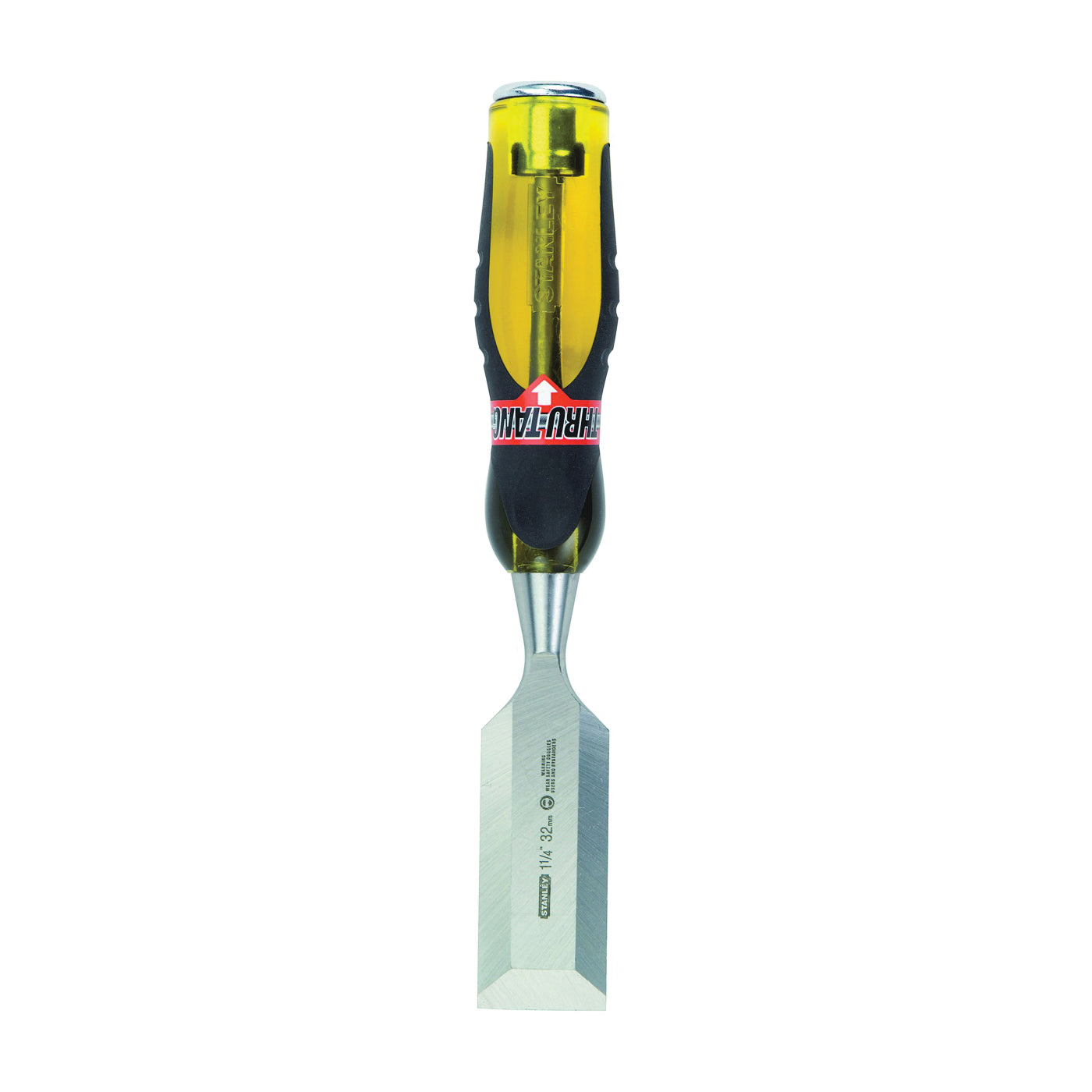 Precision ground, hardened, tempered high-chrome carbon alloy steel blade etched with blade size. Blade has a steel striking cap for use with steel headed hammer. Blade guard can be mounted to wall for storage. Ergonomic, bi-material grip handle is break resistant. Overall length is 9 in.