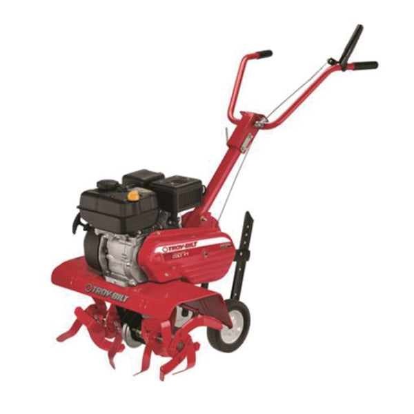 208 cc Troy-Bilt OHV engine. 13/22/24 in adjustable tilling width. 7 in tilling depth. 12 in steel bolo tines. 5 in semi pneumatic transport wheels. one-speed forward. Forward rotating tines. Minimal assembly.