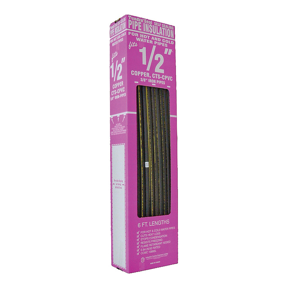 Tundra brand polyethylene pipe Insulation is a flexible and easy-to-apply tubing product available in semi-slit and self-sealing styles. It is packaged in cartons that feature the copper tube sizes in bold color-coded print. The Self-Sealing version has yellow self-seal release liner that is both easy to see and peel. Tundra brand polyethylene pipe Insulation is sold in all the common sizes required for home plumbing systems, including special fittings for tees and 90 deg elbows. This chemically inert pipe insulation has a closed-cell structure that allows it to function as an efficient insulator.