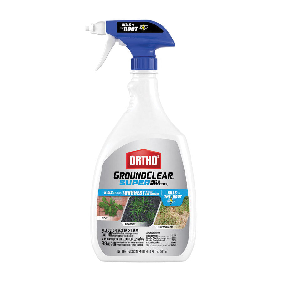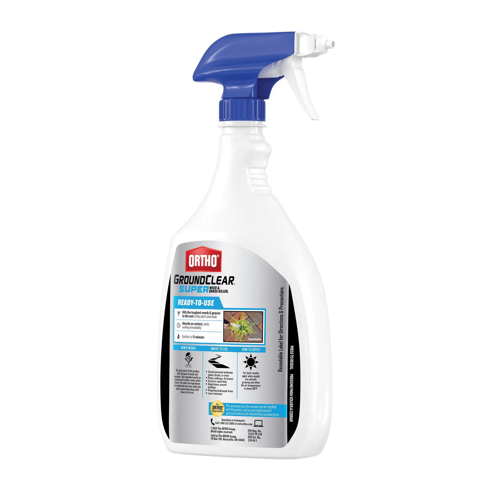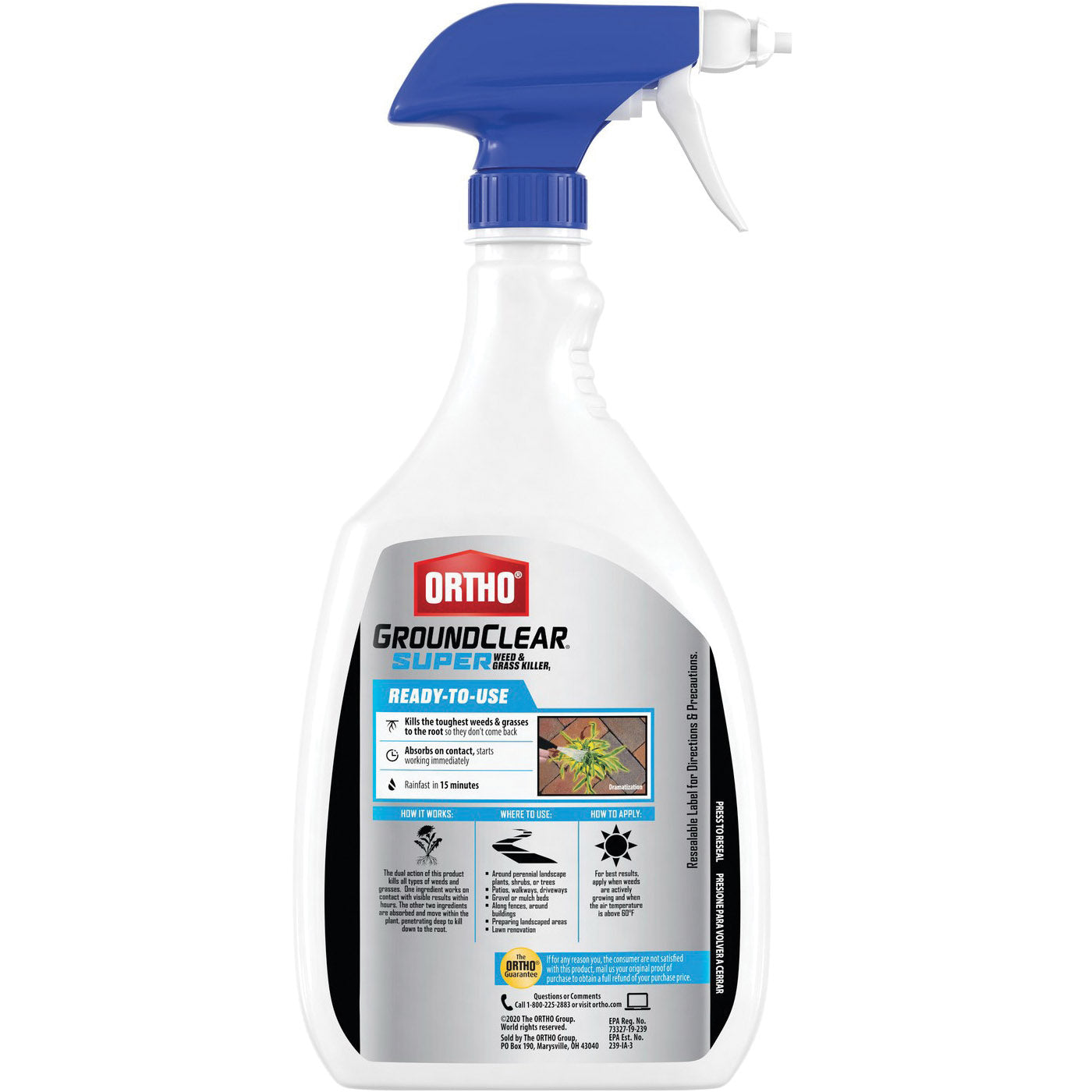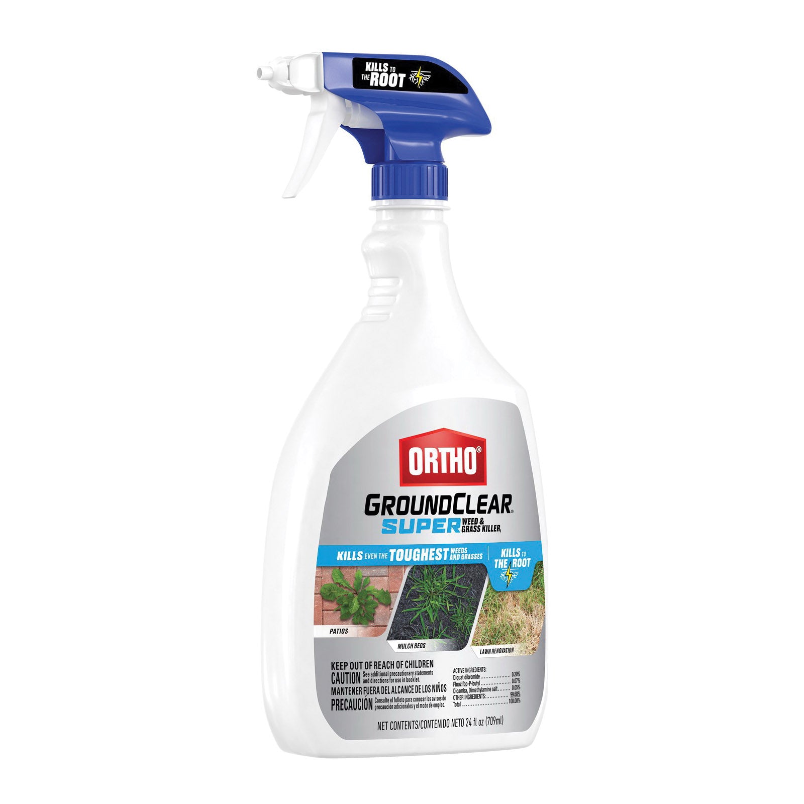 Use Ortho® GroundClear® super weed and grass killer to kill over 175 different weed and grass types including crabgrass, dandelion, nutsedge and oxalis. The quick kill, dual-action formula starts working immediately as one ingredient kills on contact while the other penetrates deep into the plant to kill all the way down to the roots. Sprayed weeds usually begin to wilt within hours after being treated, with weeds completely killed in one to two weeks. Apply this ready-to-use weed and grass killer in landscape areas, patios, walkways, gravel, mulched areas, along houses and fence lines and on driveways when weeds are actively growing and the air is calm. It's easy-to-use, simply turn the sprayer nozzle to the desired setting and squeeze the trigger repeatedly. Rainfall or watering 15 min after application will not reduce the effectiveness of this powerful weed control. A single application of Ortho® GroundClear® super weed and grass killer will start to control even the toughest weeds and grass right down to the roots.