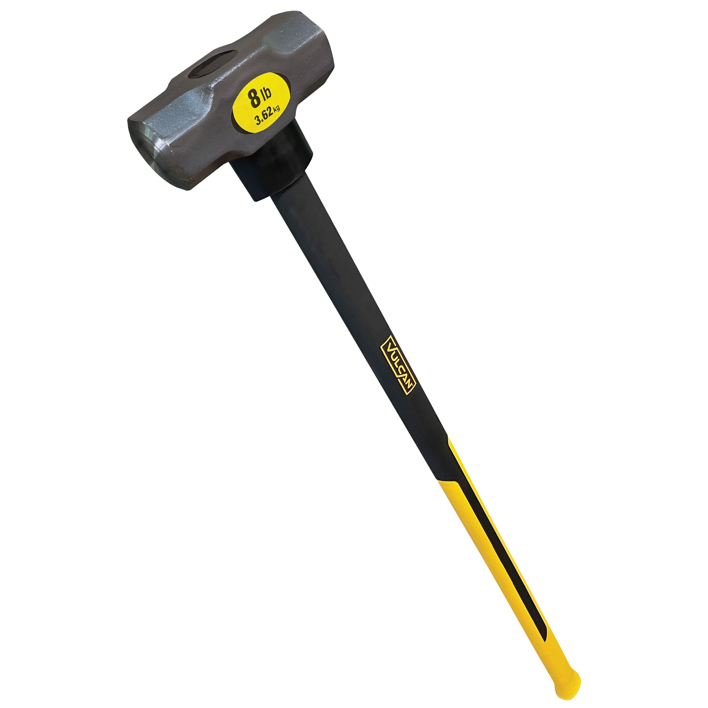 Sledge hammer has a steel, 8 lb head and a yellow & black, fiberglass handle. Head measures 6-1/4 L in and the handle measures 30-3/4 L in.
