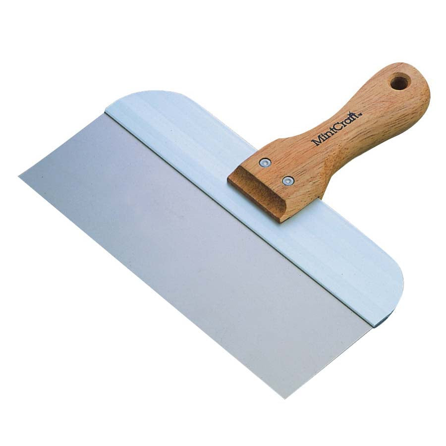 Premium stainless steel blade with aluminum backing plate. Blade is tapered so you can run corners faster and easier. Wood handle is securely attached.