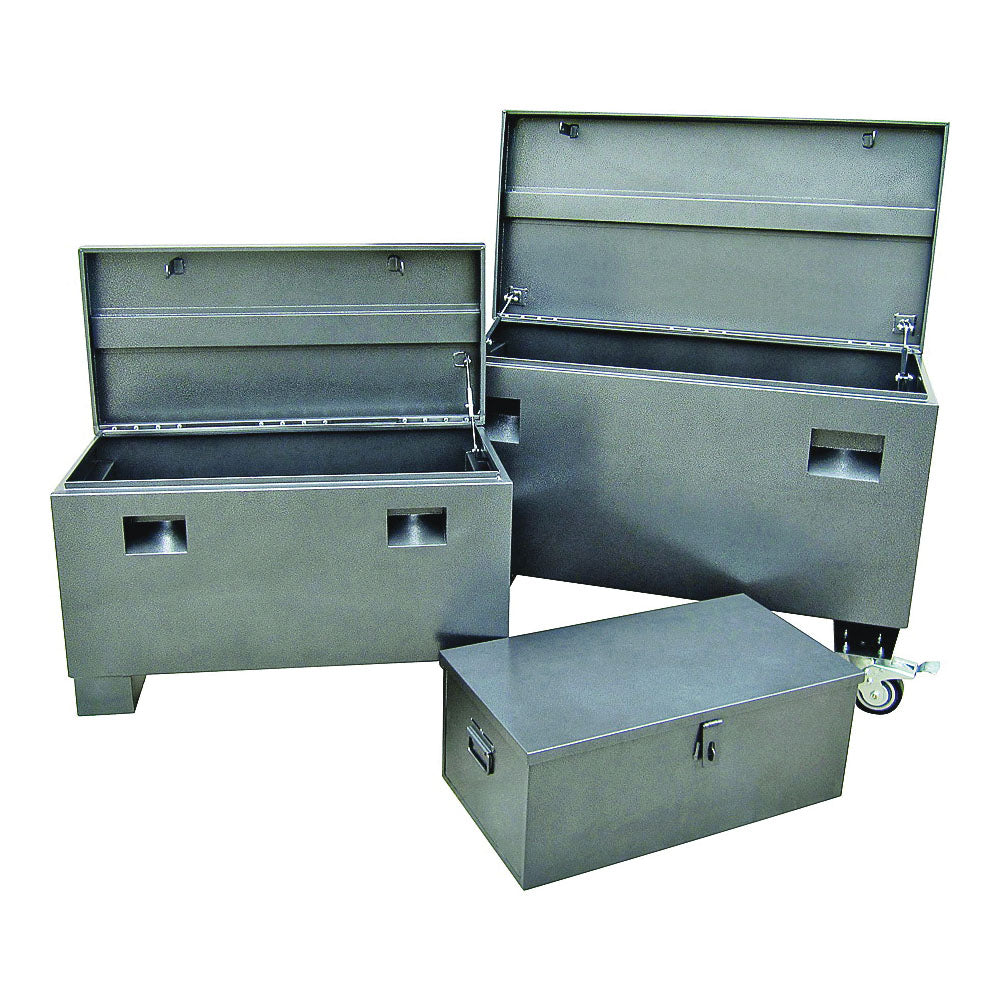 These solid 16 ga steel 48 in, 36 in boxes & 20 ga steel 30 in boxes has MIG welded seams for extra durability. It's tamperproof locks keep tools safe. The heavy-duty locking hinge provides extra lid strength and the large and medium boxes are pre-drilled for casters. The finish is durable powder-coated for rust resistance and scratches.