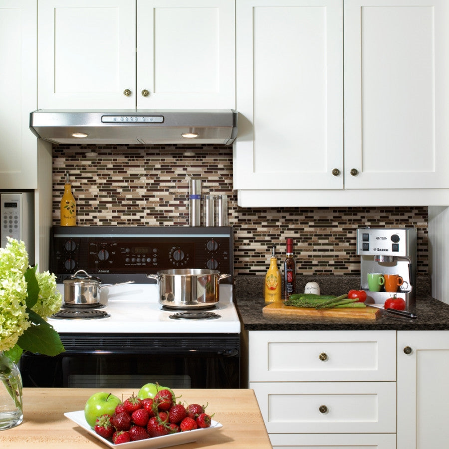 Do-it-yourself peel and stick tiles are lightweight, easy to handle, cut and maintain. Sticks without adding extra glue, does not yellow or crack with time. Can be installed in minutes over a clean and smooth surface without any mess or specialized tools. Designed for kitchen and bathroom environments (backsplashes), the tiles are resistant to the heat of stovetops and the humidity of bathrooms (do not use in shower). Tiles can be cut to size with a razor blade and a straight edge or a sharp pair of scissors.