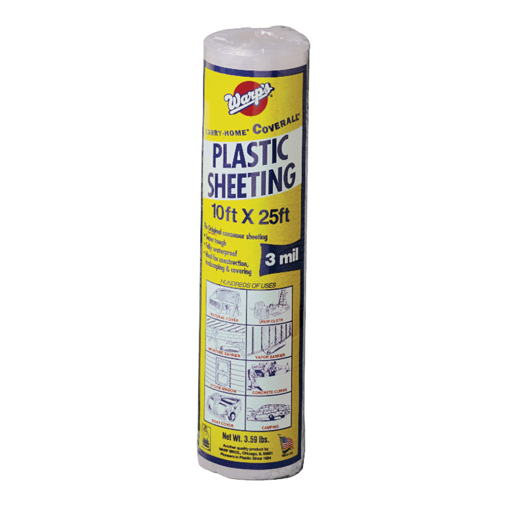 Super tough, fully waterproof plastic sheeting used by DIYers and contractors for large and small construction, landscaping or covering projects. Warp's shelf-pack, wrapped on a solid core, will sit upright on a shelf or horizontally in a bin with vertical design on front panel and horizontal on rear for flexibility in displaying. Consumer.