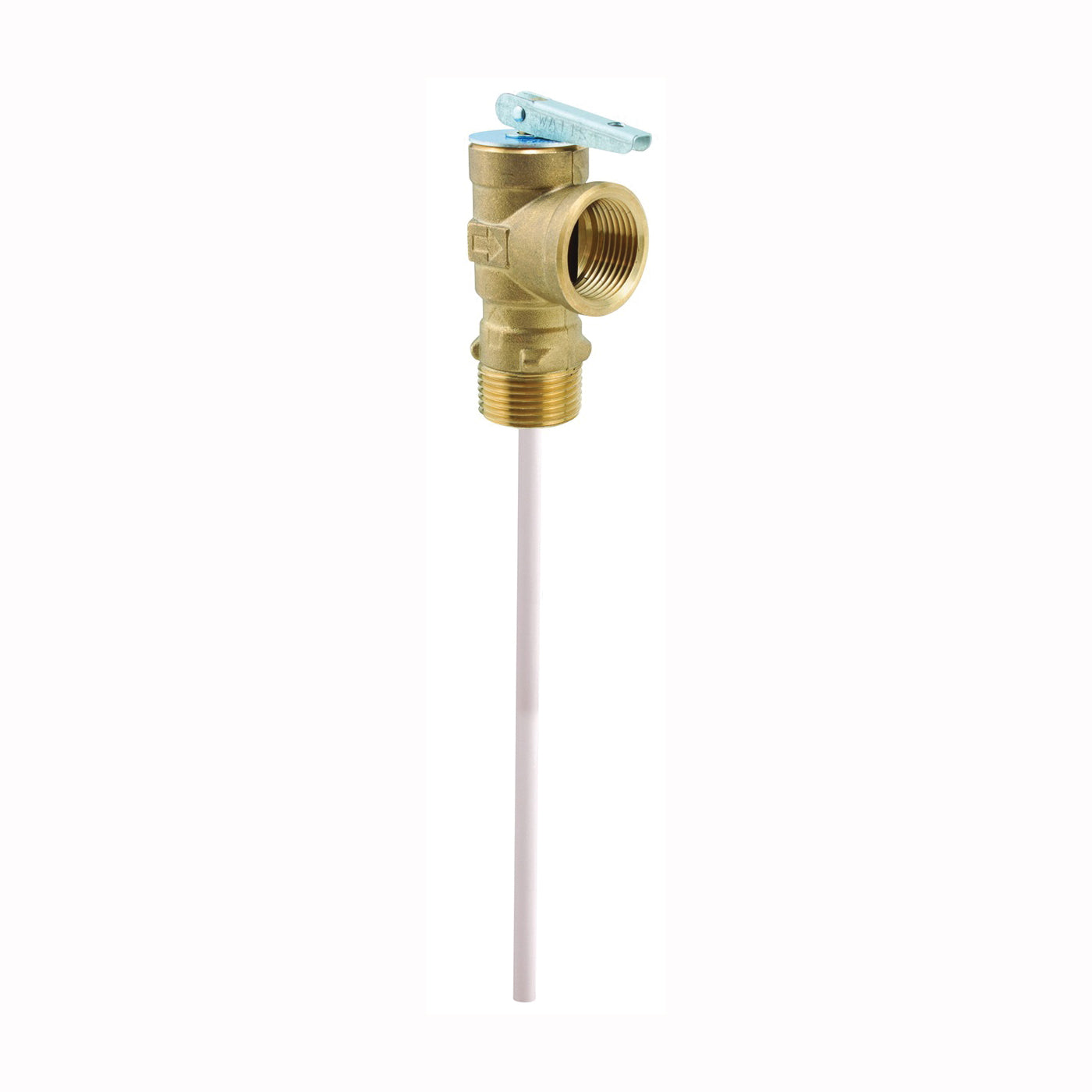 Used in water heater and hot water storage tank applications to provide automatic temperature and pressure protection to hot water supply tanks and hot water heaters up to 105,000 Btu/hr. Features a bronze body with NPT male inlet and NPT female outlet connections, unique thermostat with special thermo-bonded coating and a test lever. ASME rated and CSA listed. Temperature relief is 210 deg F (99 deg C), Pressure relief range is 75 to 150psi (5.2 to 10.3 bar).